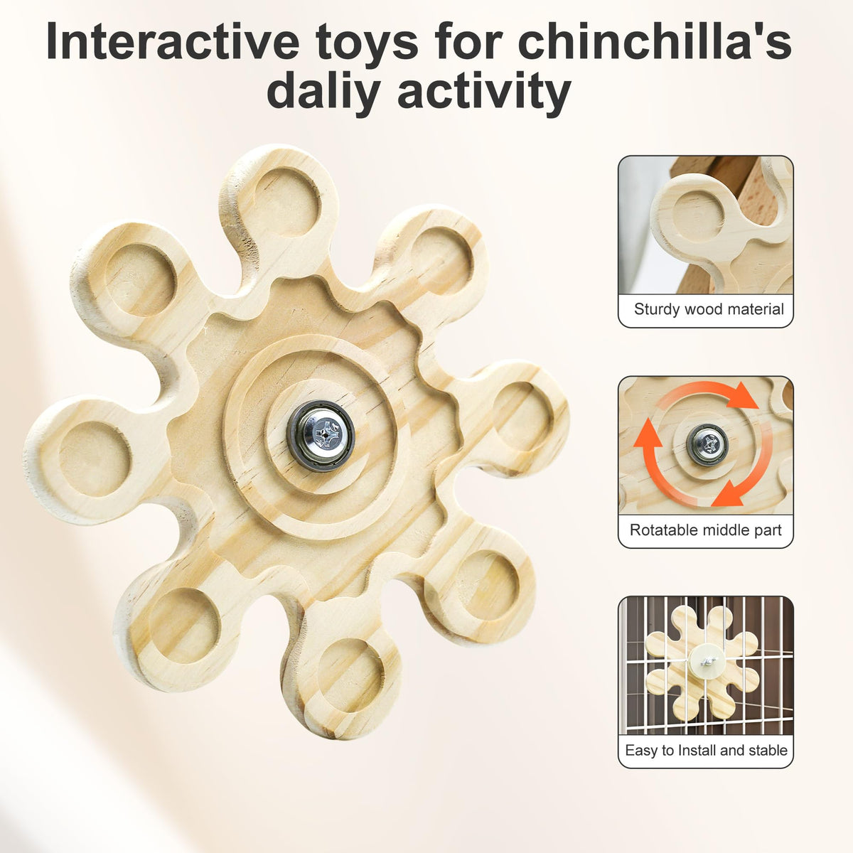 Chinchilla Chew Toy - Durable &Amp; Engaging Dental Care Solution For Small Pets Crafted With Your Pet'S Safety And Happiness In Mind, Our Premium Chew Toy Combines Functionality And Fun To Become An Essential Addition To Your Furry Friend'S Habitat. ?Premium Safe Materials Made From A Durable Blend Of Natural Wood, Pet-Safe Plastic, And Rust-Resistant Stainless Steel, This Chew Toy Is Built To Withstand Vigorous Chewing While Prioritizing Safety.&Nbsp; &Nbsp;The Sturdy, Non-Toxic Materials Resist Breakage And Deformation, Ensuring Long-Lasting Use Without Compromising Your Pet'S Well-Being.&Nbsp; &Nbsp;Rest Easy Knowing Your Chinchilla, Rabbit, Or Guinea Pig Can Gnaw And Play Safely For Hours. ?Supports Healthy Dental Development Designed As A Natural Teeth-Grinding Aid, This Toy Helps Small Animals Manage Continuously Growing Teeth.&Nbsp; &Nbsp;Perfect For Chinchillas, Squirrels, Bunnies, And Guinea Pigs, It Encourages Healthy Chewing Habits To Prevent Overgrown Teeth And Dental Issues.&Nbsp; &Nbsp;The Textured Surfaces Engage Jaw Muscles, Turning Essential Dental Care Into An Enjoyable Activity. ?Quick &Amp; Hassle-Free Setup No Tools Or Expertise Needed!&Nbsp; &Nbsp;Simply Screw The Toy Onto Your Pet'S Cage Bars In Seconds.&Nbsp; &Nbsp;Its Secure Installation Keeps The Toy Firmly In Place While Adding A Playful Decorative Touch To Their Environment.&Nbsp; &Nbsp;Busy Pet Parents Will Love The Effortless Setup That Saves Time Without Sacrificing Quality. ?Bond Through Interactive Play Measuring 6.1 Inches (15.5 Cm) In Diameter, This Rotating Toy Is Perfectly Sized For Interactive Sessions.&Nbsp; &Nbsp;Hand-Feed Treats Through The Design Or Spin It Together To Stimulate Curiosity And Strengthen Your Bond.&Nbsp; &Nbsp;Watch As Your Pet Stays Mentally Engaged, Reducing Boredom And Encouraging Natural Behaviors. ?Versatile For All Small Pets Whether You Have An Energetic Chinchilla, A Curious Guinea Pig, Or A Playful Rabbit, This Multifunctional Toy Adapts To Their Needs.&Nbsp; &Nbsp;Its Species-Inclusive Design Supports Chewing, Climbing, And Exploration, Making It A Must-Have For Any Small Pet Owner Seeking Enrichment And Durability. Invest In Your Pet'S Health And Happiness Today - A Chew Toy That Grows With Them And Grows Your Connection!