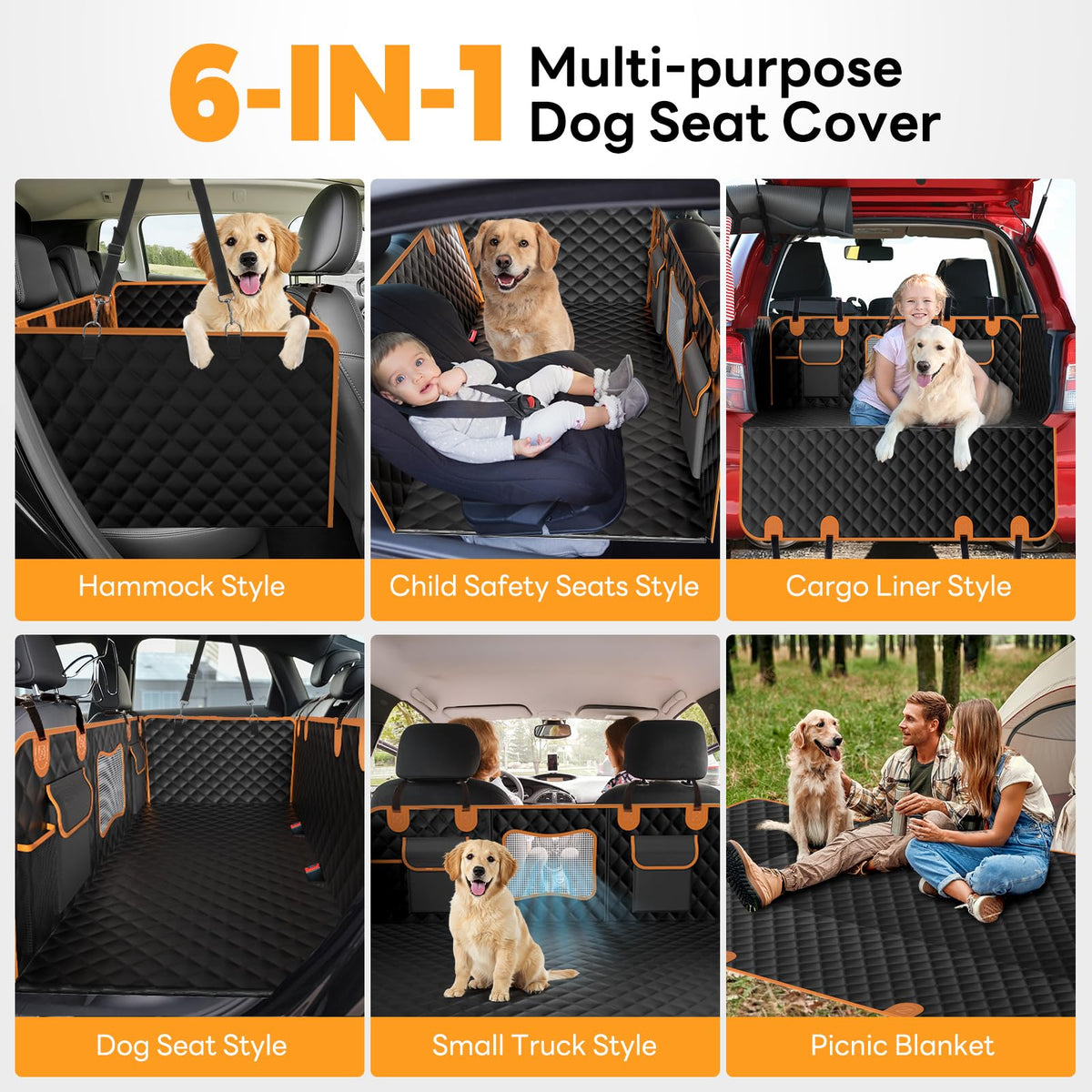 Chioratree Dog Car Seat Cover for Back Seat with Hard Bottom This dog back seat extender adds a lot of room for your dogs, and provides them strong support up to 450 lbs. Dog Car Hammock with Side Flap The dog seat cover provides full protections for your back seat and doors. Zippered side flaps make it easy for dogs to get in and out of the car. Share Your Seat with Your family The dog bed for car can be foldable for passenger, or child car seat. with Viewing Window and Pockets Mesh window greatly reduces anxiety and provides better air circulation for your dog. 2 Pockets can store leashes, toys and dog travel essentials. Extra Room & Universal Fit The dog car bed gives your dogs extra room to stretch out and prevents them from falling onto the floor. The dog back seat protector fits cars with space (from back of the seat to the backseat air vents) larger than 52 x 24.8 inch. 100% Waterproof The waterproof dog back seat cover can keep your car clean and dry, preventing your seat from mud, liquid, fur. Easy to Clean The dog seat cover for car is easy to clean with a damp cloth or vacuum. It s also recommended to dry naturally after hand washing. Specification: Name: Dog Seat Cover for Back Seat Color: Black+Orange Size: 63 x 52 (132 x 160cm) Weight: 8.8lbs Material: Heavy Duty Oxford Cloth, Thickness Load-bearing Plate Capacity: 450 lbs Compatible For: Family Car, Truck, SUV, Sedan, etc.