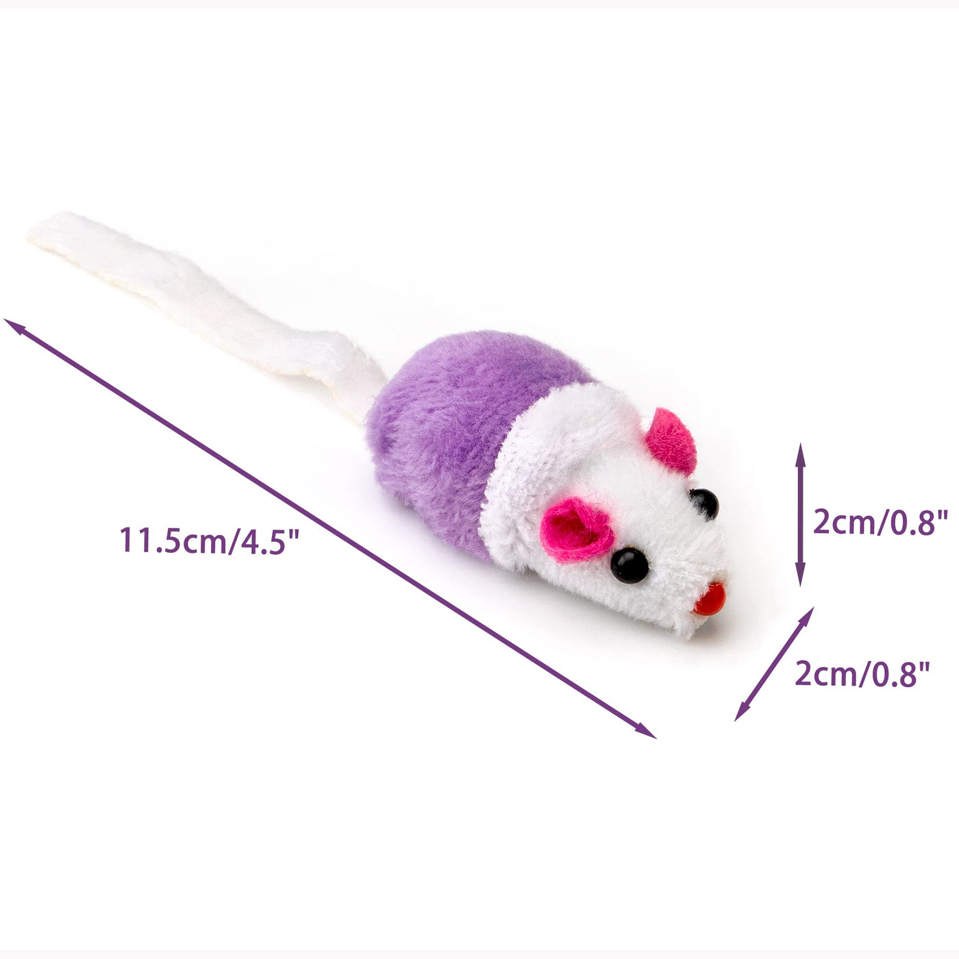 Q: What are the dimensions of the CHIWAVA Interactive Cat Toys?A: Each toy measures approximately 4.5cm (1.8 inches) in length, 2cm (0.8 inches) in height, and has a tail length of 7cm (2.7 inches).