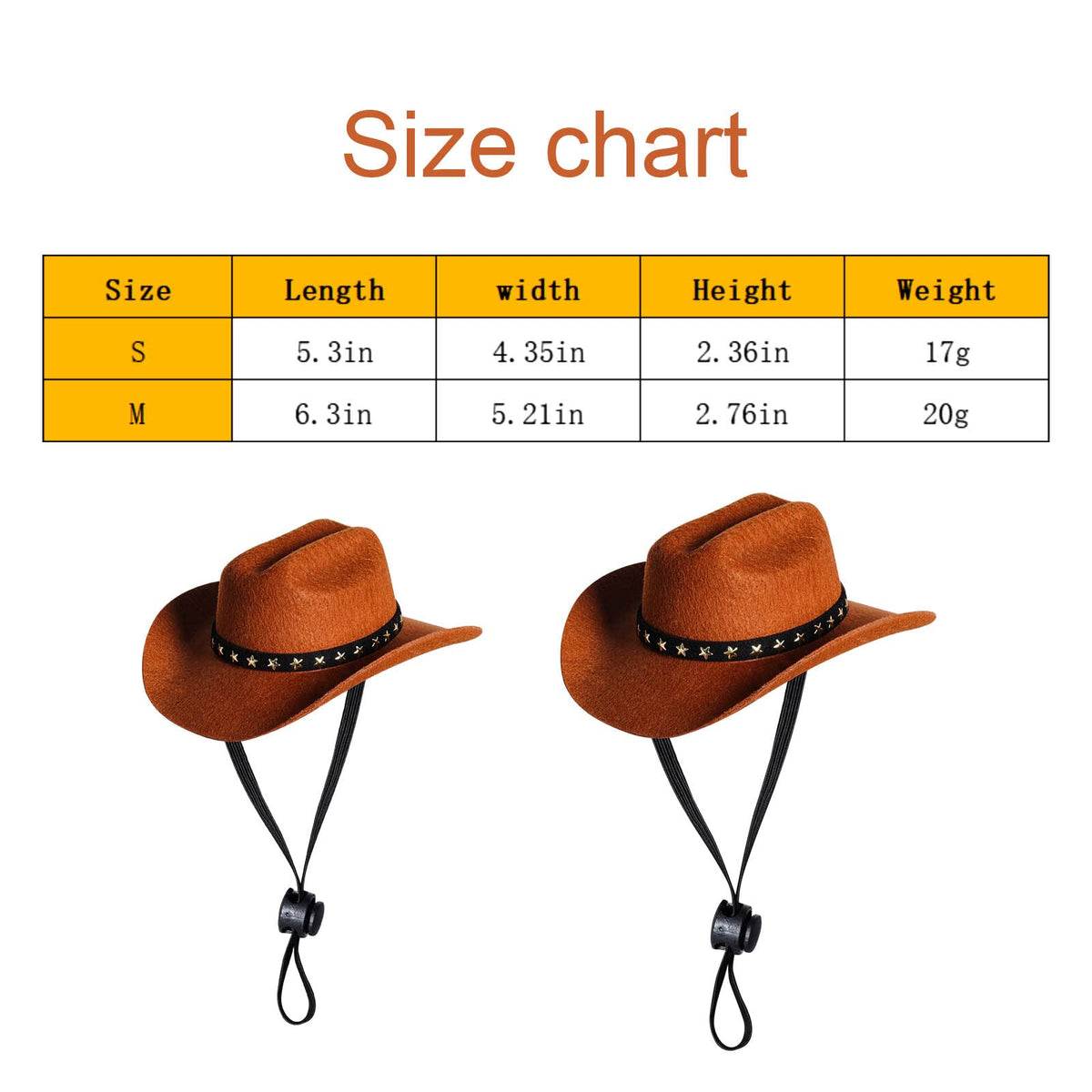PACKAGE INCLUDED: brown cowboy hat × 1pc SIZE: S:5.3*4.3*2.36inch/13.5*11*6cm L:6.3*5.21*2.76inch/16*13*7cm please choose the right hat according to the size of the pets STYLISH CUTE LOOK: The pet cowboy hat with gold star pin is made of polyester, which are durable, comfortable for wearing. No matter a party with your pet or in daily life,the cute style makes pets looks cool, stand out from the crowd. WILDLY APPLICATION This costumes set is suitable for western themed parties, Halloween, Christmas, Holiday, Birthdays, Carnival Party, Cosplay and is also suitable for pet cat or dog as daily wear. NOTE ---It's only for decoration, can't be bitten or scratched, can't be used as toys. ---If you have any questions after receiving the goods, please contact us by email in any time, we will give you a satisfactory answer as soon as possible.