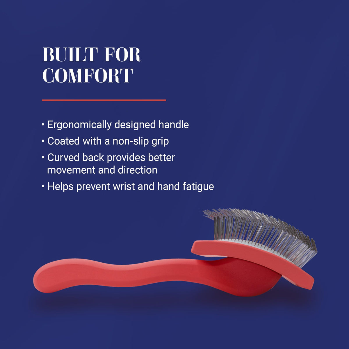 Q: What makes the Chris Christensen Big G Dog Slicker Brush different from other dog brushes?A: The Chris Christensen Big G Dog Slicker Brush is designed specifically for shedding and detangling, featuring extra-long angled pins that reach deep into the coat to effectively remove dead and loose undercoat with fewer strokes. It contains 30% more pins than standard slickers, making it more efficient for grooming.