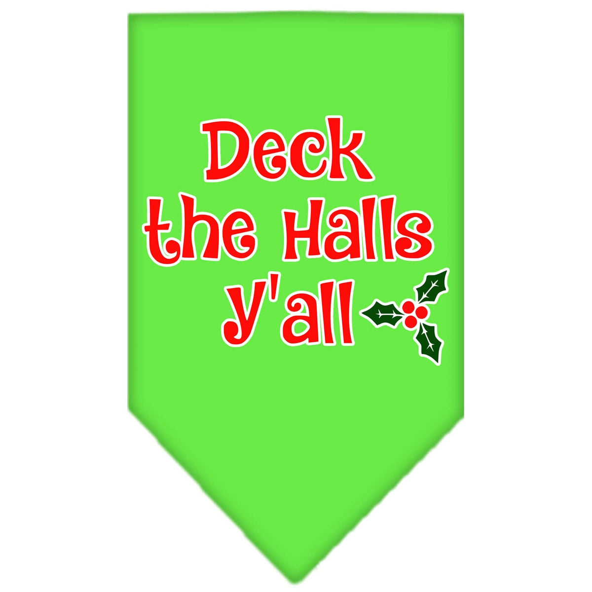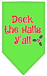 Q: What makes this bandana a good choice for the holidays?A: This bandana features the playful screen print 'Deck The Halls Y'all' in a vibrant lime green color, making it a great way to showcase your pet's personality during the holiday season. It's perfect for festive gatherings, photo opportunities, or simply spreading holiday cheer.