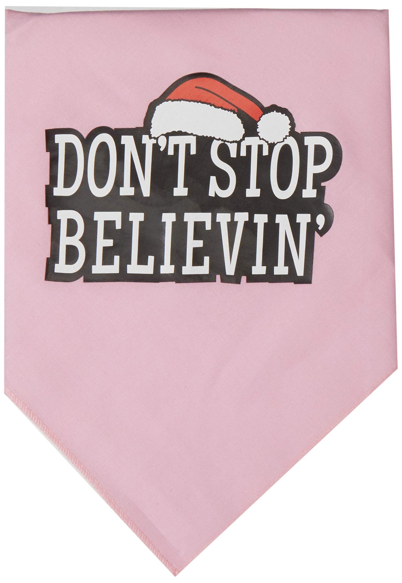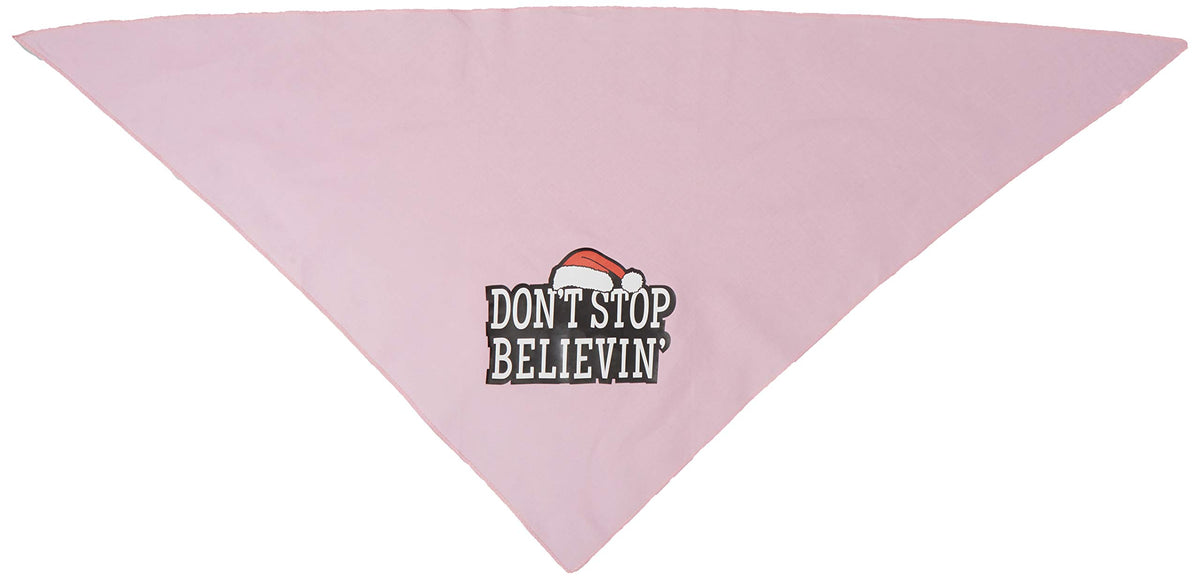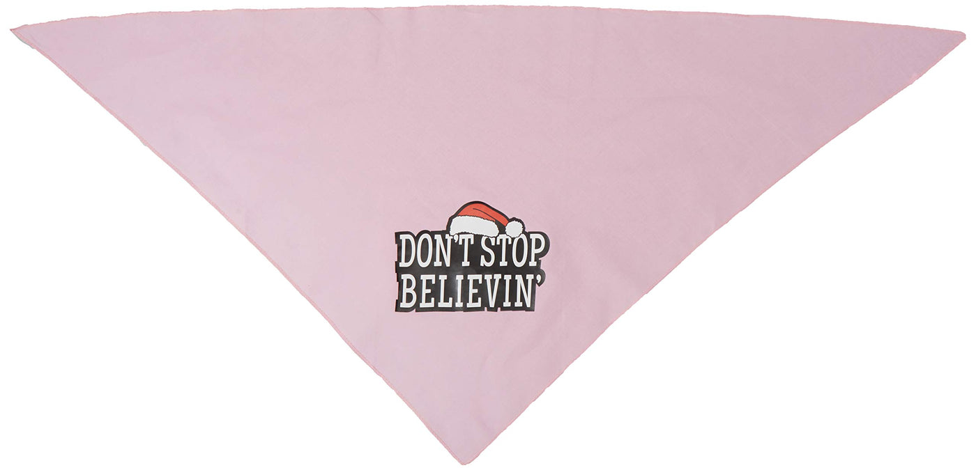 Q: What makes this bandana a great choice for my pet during the holiday season?A: This bandana features a festive 'Don't Stop Believin'' design in light pink, allowing your pet to join in on the holiday spirit while showcasing their personality.