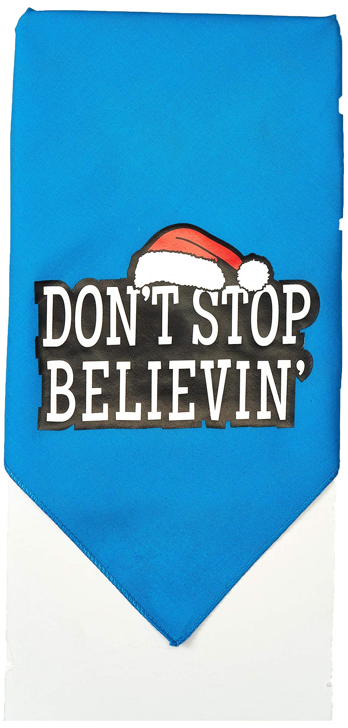 Q: What is the design of the bandana, and what occasion is it suitable for?A: The bandana features a fun and festive screen-printed design that says 'Don't Stop Believin'' in turquoise, making it perfect for holiday celebrations, family gatherings, or everyday wear to showcase your pet's personality.