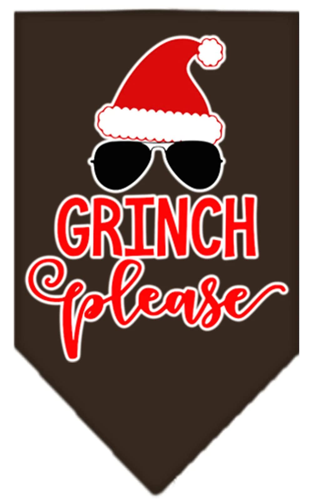 Christmas Pet and Dog Bandana Screen Printed, "Grinch Please" All of our Bandanas are tie-on only (no buckles) and are available in the following sizes: Small - 14" x 14" square - Easily fold in half to create the triangle look needed. Roll the bandana until you reach a desired length down the back, then tie around the dog's neck. Large - 22" x 22" x 31" pre-cut triangle - Fits most dog breeds. Roll the bandana to the desired look before tying around the pet's neck. Our designs are placed in the lower corner to allow for this.. BOTH SIZES ARE FOR TIE-ON ONLY, THERE ARE NO BUCKLES ON THESE PRODUCTS