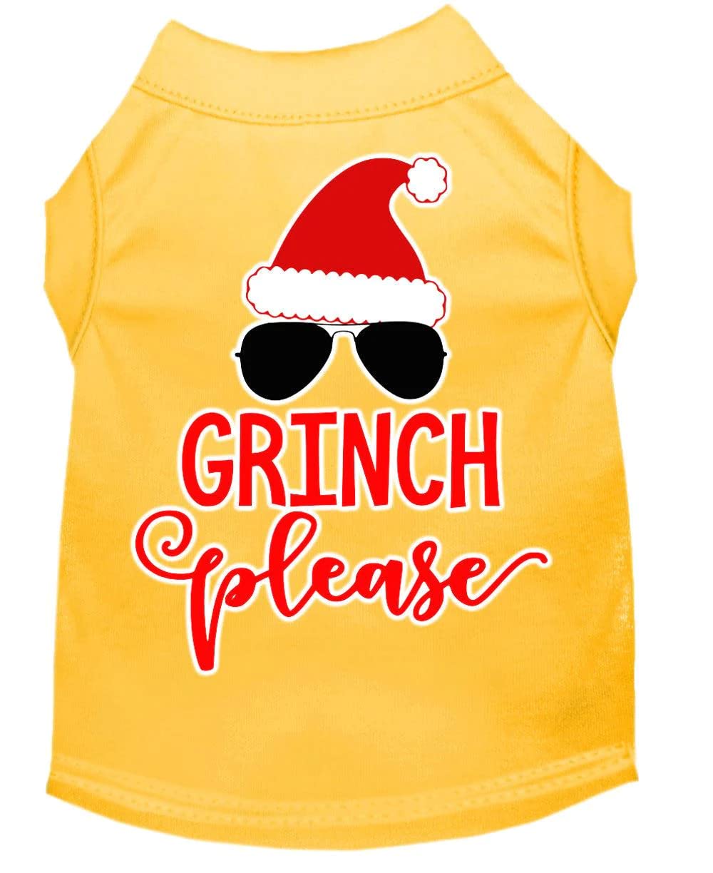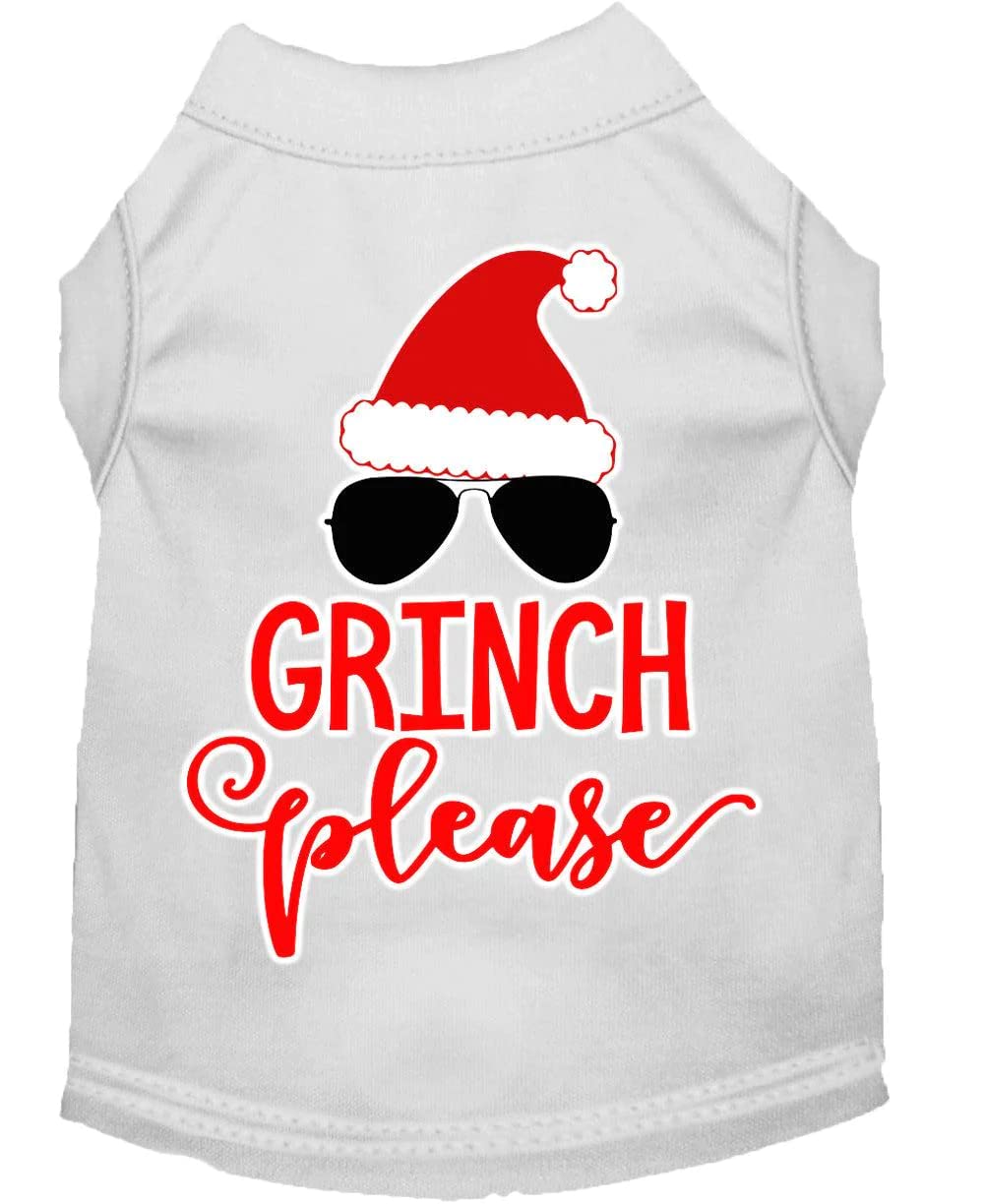 Q: What material is the 'Grinch Please' dog shirt made from?A: The 'Grinch Please' dog shirt is made from a comfortable cotton blend, ensuring a soft fit for your pet.