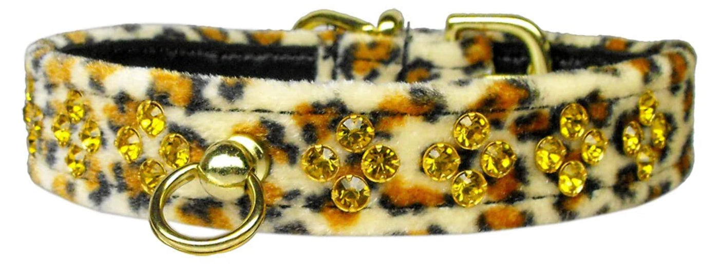 Q: What materials are used in the collar's design?A: The collar features an animal print design adorned with two rows of offset Austrian crystals, adding a stylish touch while remaining durable.