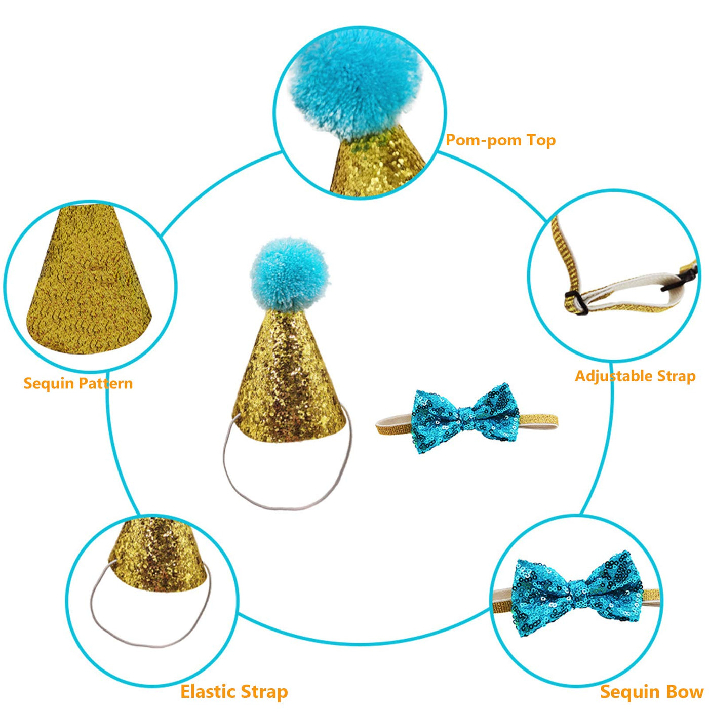 Q: How do I secure the birthday hat and bow tie on my pet?A: The birthday hat and bow tie feature an elastic design that makes them easy to wear and take off. You can also tie the chin band of the hat to ensure a snug fit, especially if it feels too loose or big for your pet.