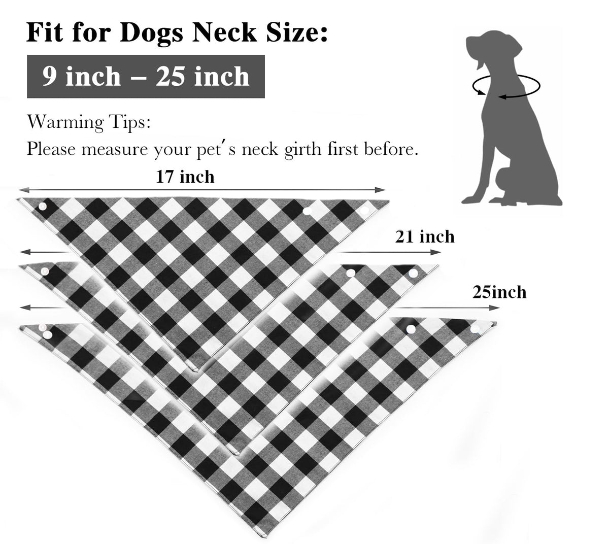 Q: What sizes are available for the Christmas Plaid Dog Bandana?A: The Christmas Plaid Dog Bandana is available in three sizes: 7-17 inches, 8-21 inches, and 9-25 inches. This range accommodates small, medium, large, and extra-large dogs, puppies, and cats.