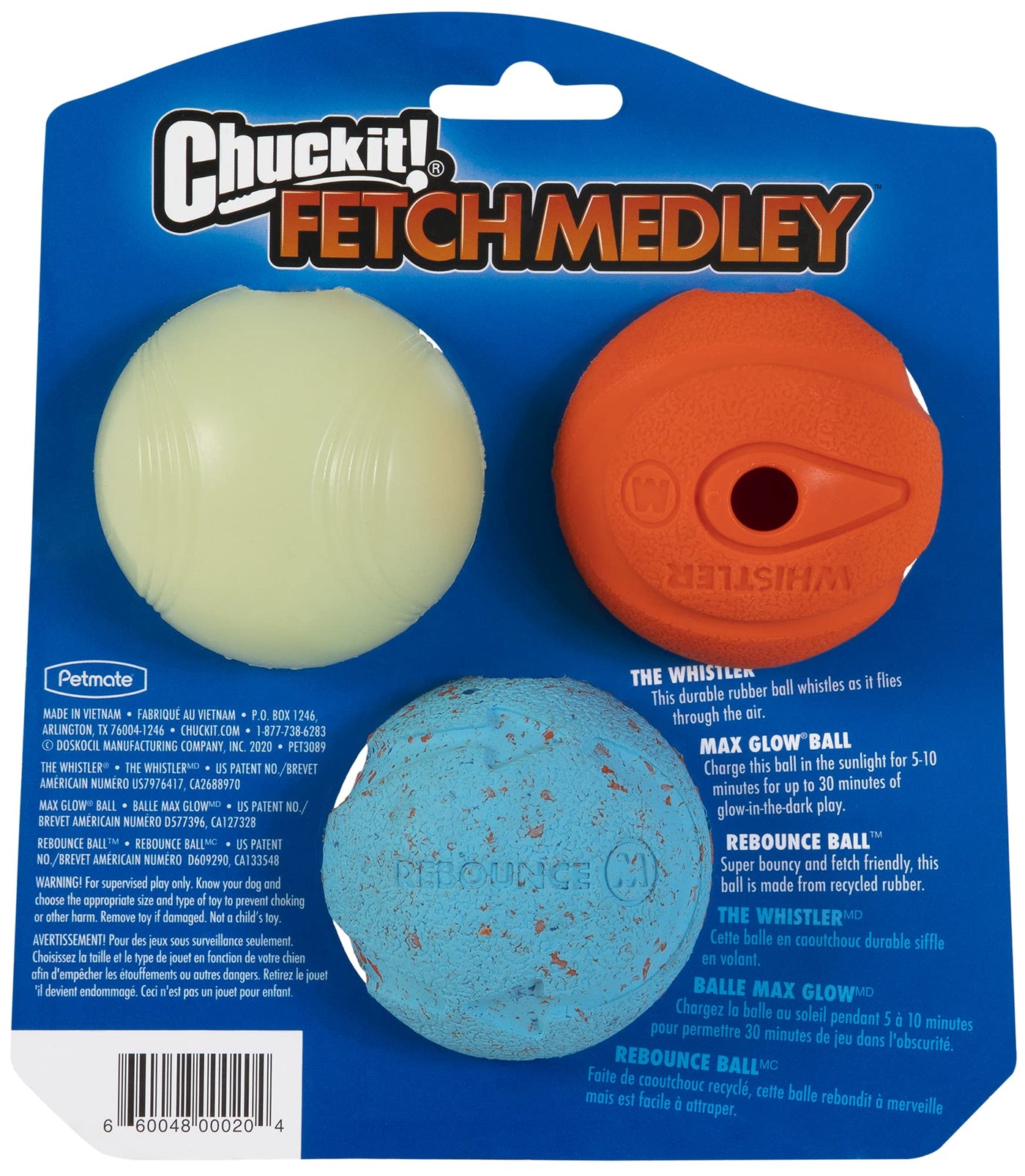 Chuckit! Fetch Medley Dog Ball Dog Toys, Medium (2.5 Inch) Pack Of 3, For Medium Breeds, Includes Whistler, Max Glow And Rebounc