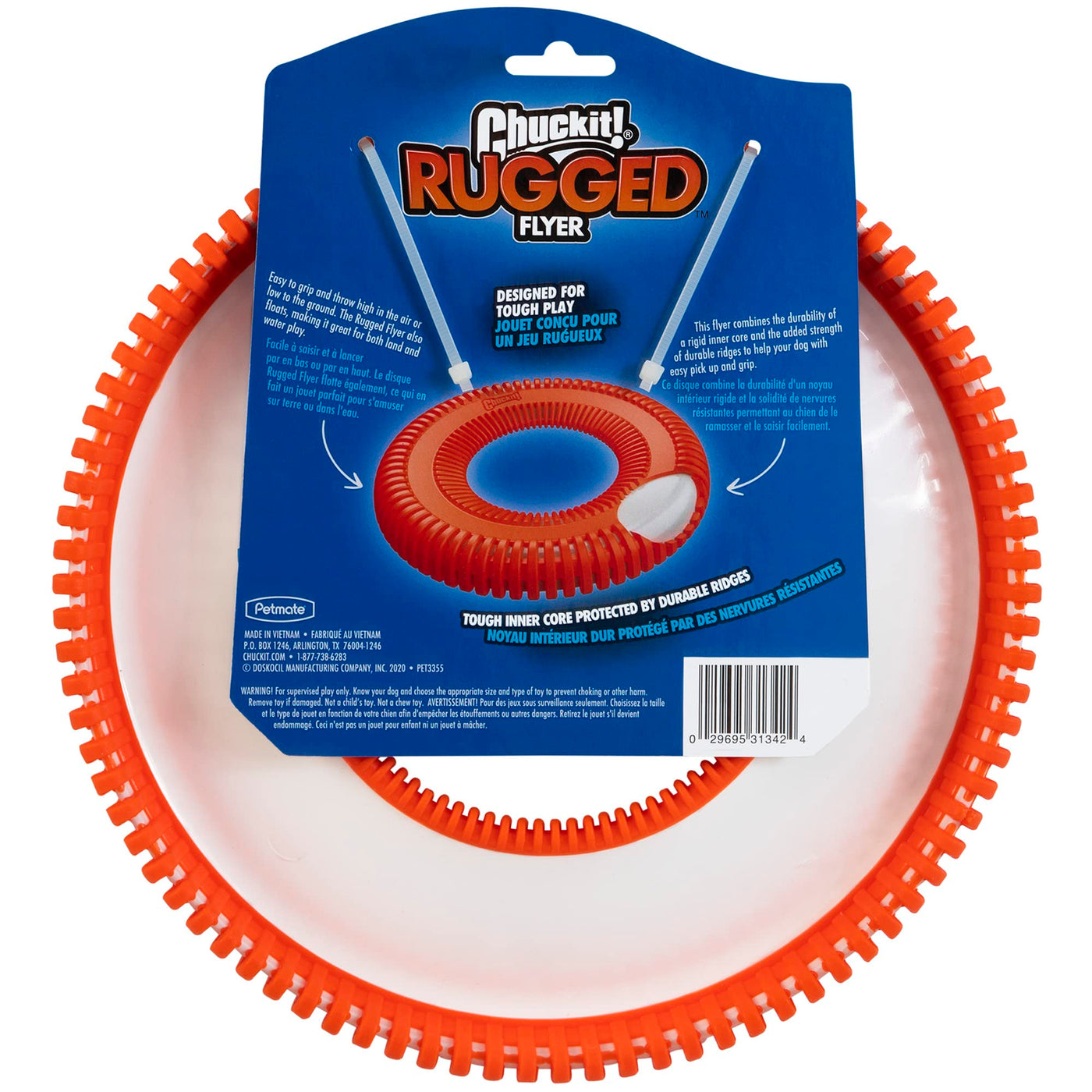 Q: Is the Chuckit! Rugged Flyer Dog Toy safe for my dog to chew on?A: While the Rugged Flyer is designed for fetch and play, it is not intended as a chew toy. Always supervise your pet during playtime to ensure their safety.