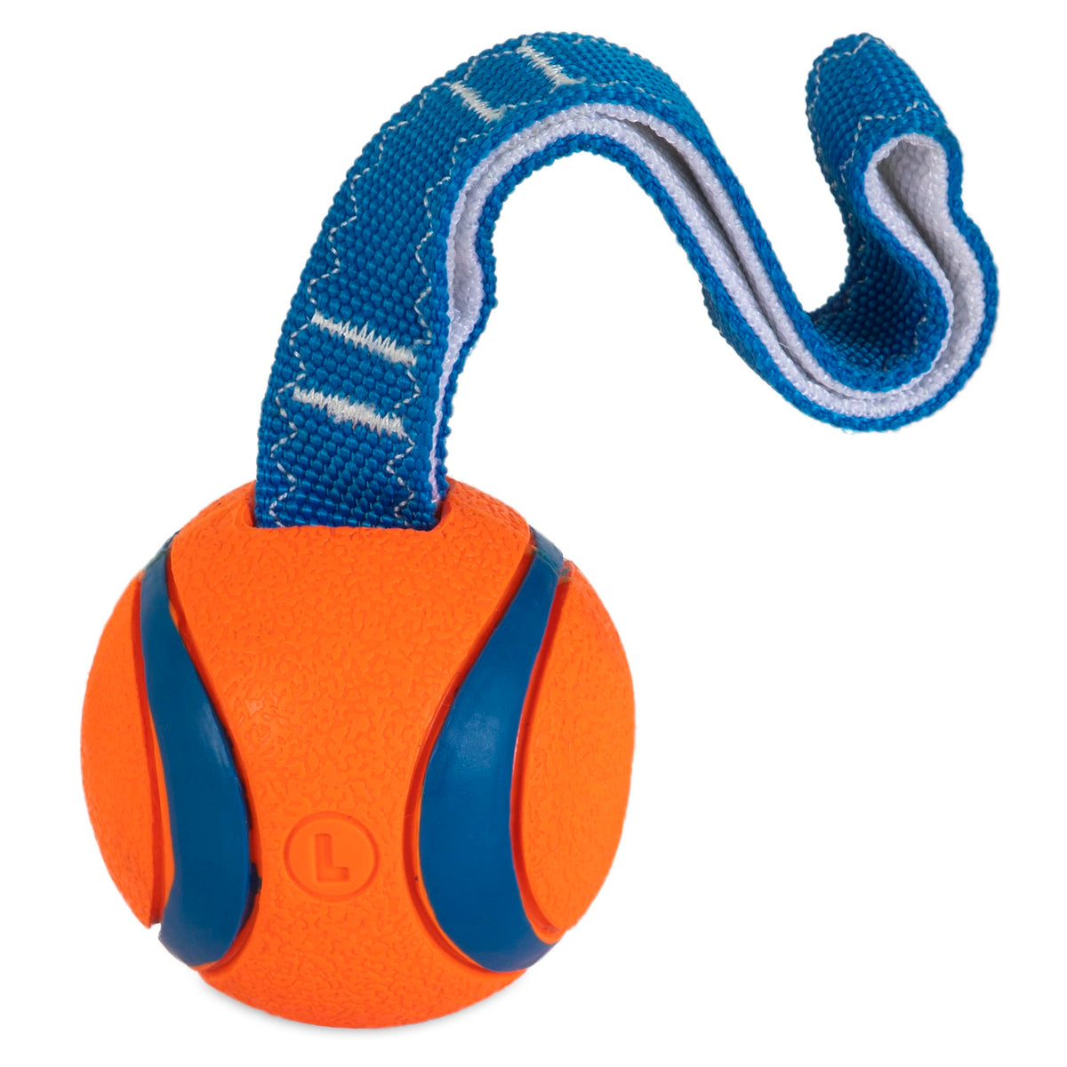 Elevate fetch and tug-of-war with the Chuckit! Ultra Tug Dog Toy. It boasts one Chuckit! Ultra Ball attached to the end of a durable two-ply nylon cord handle to take fetch and tug of war to the next level. This toy is compatible with Chuckit! Dog Ball Launcher models ending in 'L.' Its bright blue and orange colors ensure visibility in grassy areas. It’s not intended as a chew toy or for aggressive chewers. No toy is truly indestructible. Always supervise your dog during play.