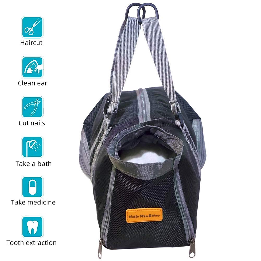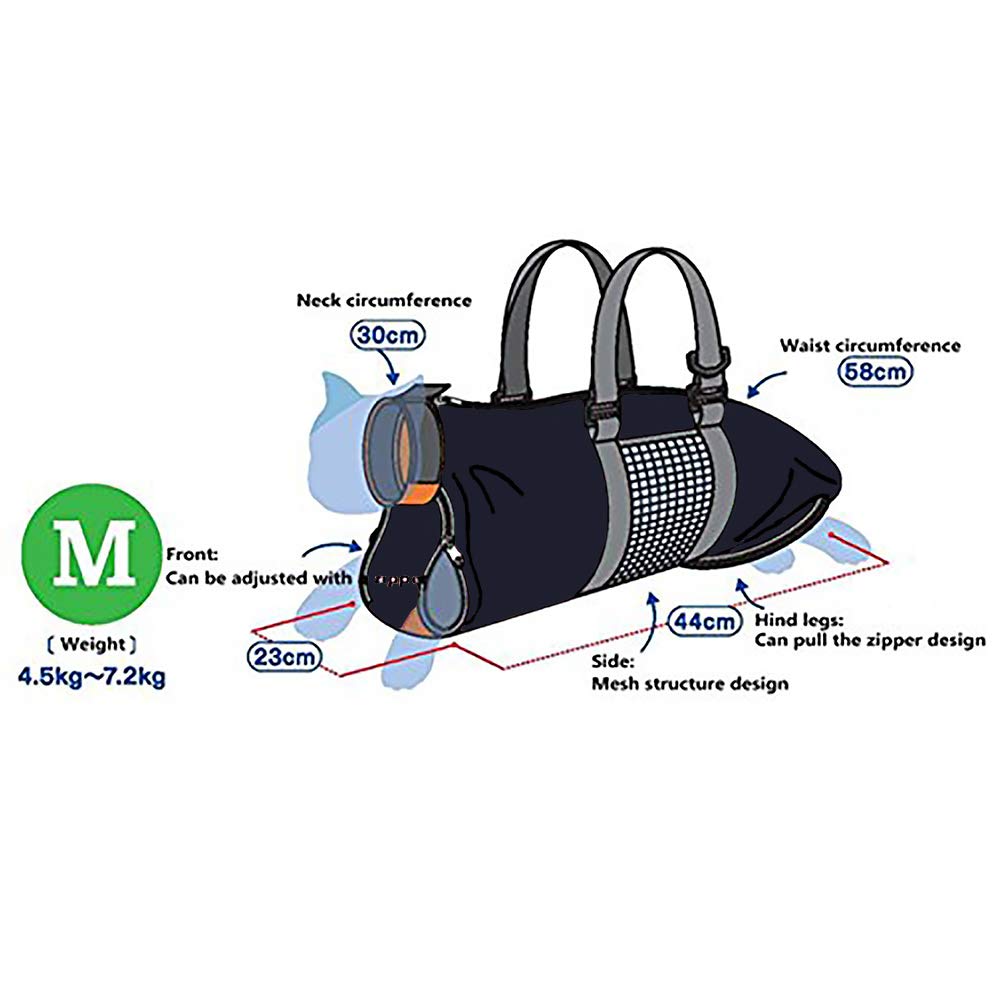 Fits cats weight:10 lbs - 15 lbs catsNeck circumference: 30cm waist circumference 68cm 23cm between the two front paws 44cm on the side Before you buy you can measure your baby to see if it matches the size Muzzle is suitable for 9lb-15lb cats If the male cat is less than 88lb and the female cat is less than 11lb it will be a little bigger Dont use it for smaller kittens wait until the cat grows up The perfect combination of muzzle + grooming Bag can help you easily complete grooming and also prevent you from being bitten by cats Mesh panel allows water in and out while bathingIt is easy for bring you cutting their nails cleaning their ears or brushing their teeth etcAnd it wont hurt themYoure worth it Features three rear zippers and two front zippers Our products are suitable for most cats but not match the cats that with big belly