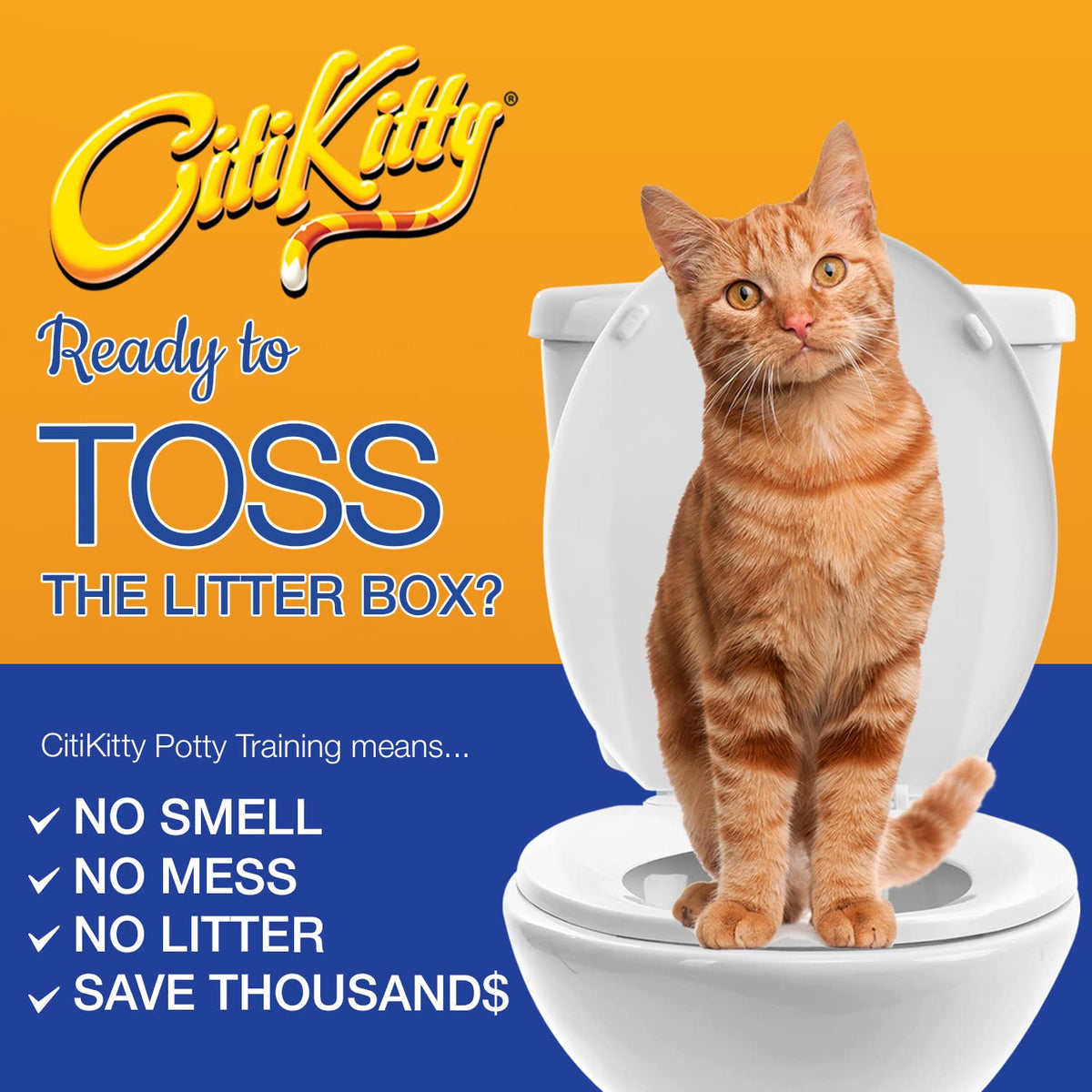 Q: How does the CitiKitty Cat Toilet Training Kit work?A: The CitiKitty Cat Toilet Training Kit features a specially-designed training seat that gradually helps your cat transition from using a litter box to the toilet. It includes an extra insert to facilitate moving forward or backward in the training process, along with an easy-to-follow guide and insider tips from training experts.