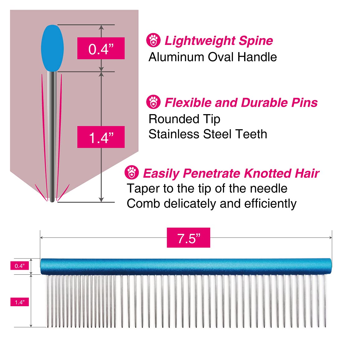 This comb not only can gently and effectively remove loose hair, knots, shed fur, eliminate tangles, mats, trapped dirt but also suitable for thick and textured coat. It perfect for finishing and fluffing, make your pets more cute and graceful under safety grooming. The design also provide your prevent slippery and slider accidents to keep your pets more safety.