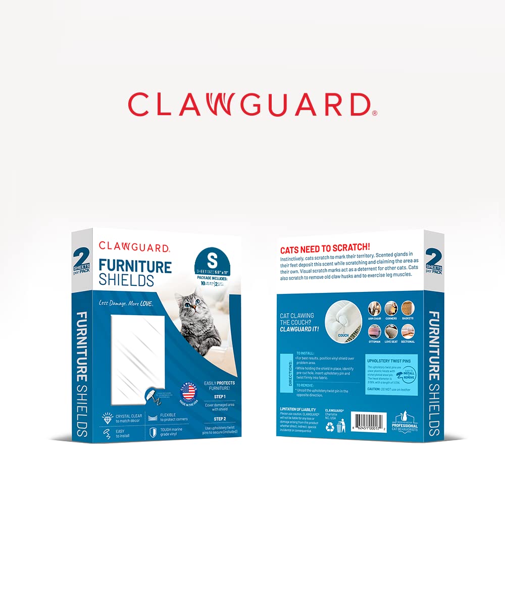 [ KEEP YOUR HOME BEAUTIFUL ] Clear and clean invisible protection. Blends with all colors and patterns of furniture. Guards against unsightly scratch marks and furniture replacements which can be expensive. Clean appearance protects furniture from sharp nails, scratching, shredding and clawing. | [ INSTALLS IN 5 SECONDS } Simply cover the targeted area with your furniture shield. Use the included clear upholstery twist pins to firmly lock the protective barrier in place - no shifting or fuss! Easily twist the pin to lock securely into fabric and counter twist to remove. No damage to furniture and No sticky residue! Pins are reusable. | [ TOUGH AND FLEXIBLE ] CLAWGUARD furniture shields creates a high-quality MARINE GRADE barrier between your cat and couch, sofa, love seat, carpet, mattress, ottoman and more! Flexible and pliable protectors fit around corners and contours of your furniture to stop the shredding. Designed to protect against the sharpest nails. | [ SAFE AND RECYCLABLE ] CLAWGUARD furniture shields are made of high-quality, crystal clear MARINE GRADE vinyl. Unlike standard vinyl, marine grade keeps color clarity. Will not yellow or cloud and is safe for Cats. Easily cut to size and wipe clean with a damp cloth to revitalize clean fresh look. | [ MADE IN USA ] We feel it’s important to support U.S. workers and businesses. Quality manufacturing and QA testing is done to ensure the best stability and reliability of each sheet of CLAWGUARD Furniture Shields. Clear, waterproof, and nail proof. Made 100% in the USA.