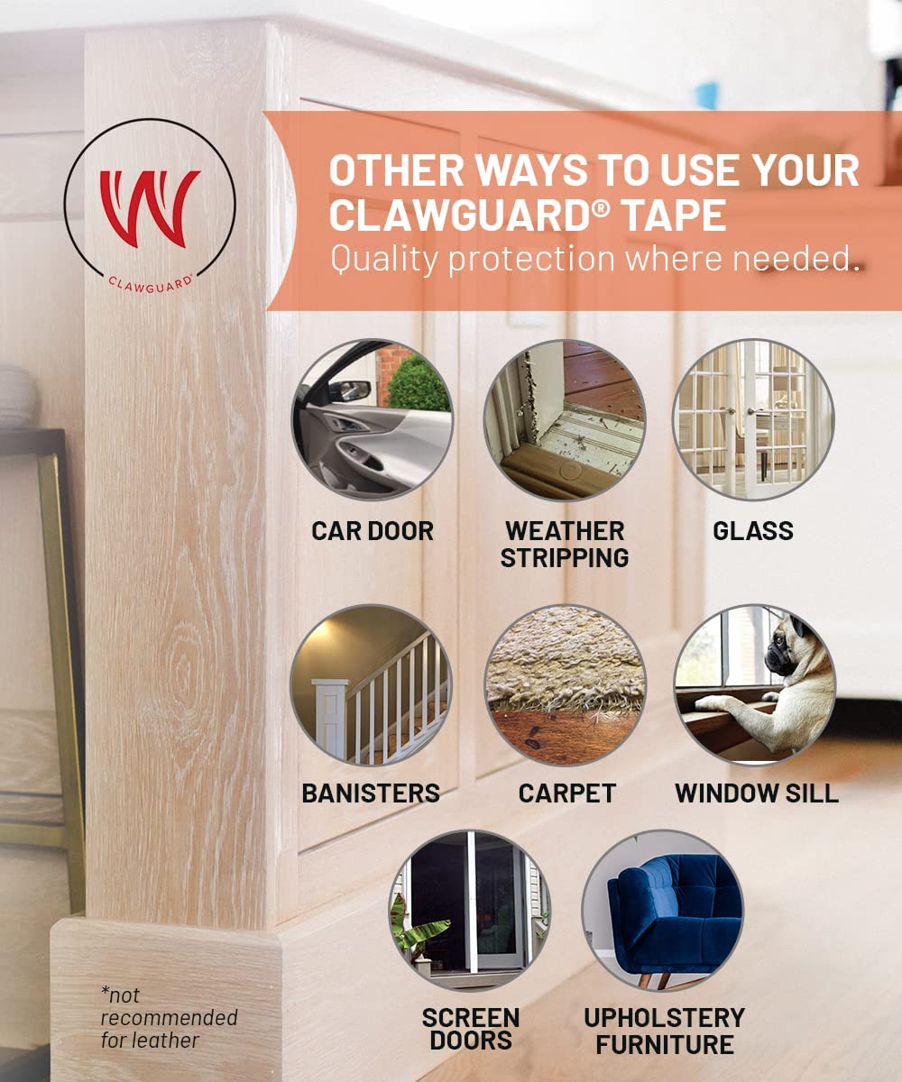 Q: Can I use CLAWGUARD Protection Tape on different surfaces?A: CLAWGUARD Protection Tape is versatile and can be applied to various surfaces such as doors, window sills, chair legs, furniture, and even car doors. However, it is not recommended for use on frayed, antique, ripped leather, drywall, wallpaper, or upholstery.