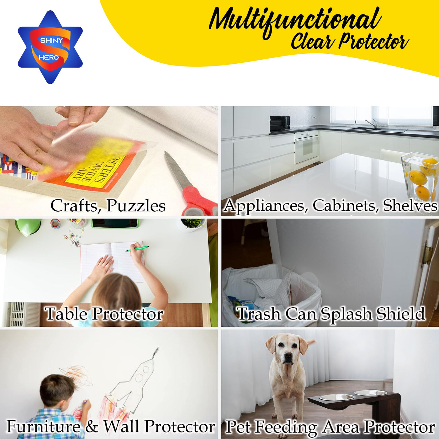 Q: What surfaces can I use the Clear Contact Paper Wall Protector on?A: The Clear Contact Paper Wall Protector can be applied to any smooth surface, including walls, tiles, furniture, wood, tables, pantry shelves, and appliances. It is designed for versatile use in kitchens, bathrooms, and other areas of your home.