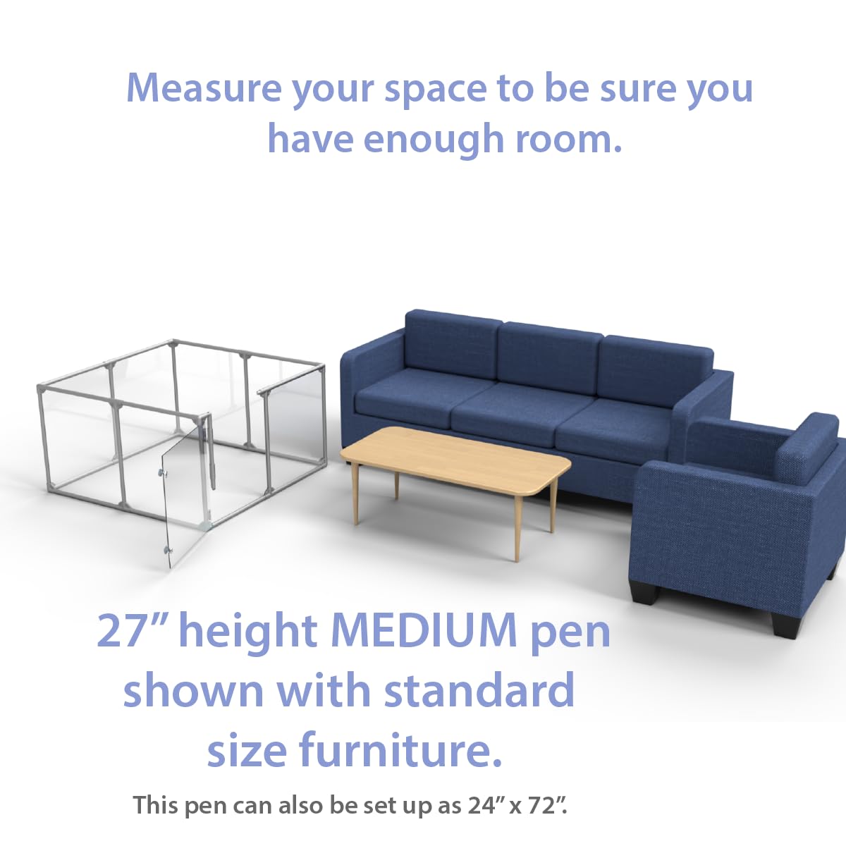 The Medium Pen Is Our Most Popular Size In The 27'' Height. It Provides A Generous Space And Can Be Set Up In Two Different Configurations, A Square (2 Panels By 2 Panels) Or A Rectangle (1 Panel X 3 Panels). We Recommend The Medium For Most Customers As It Provides The Perfect Amount Of Space And Can Easily Be Expanded If Needed.The Medium 27'' Lucidium Dog Pen Is An Oversized, Indoor Enclosure, With 3 Color Choices, A Drop-Down Bar At The Door For Walk-In Access, And Clear Acrylic Panels. All Lucidium Pens Are Intended For Small And Medium Breed Dogs (Up To 40 Lbs.), Puppies, And Other Small Animals Like Rabbits, Guinea Pigs, Kittens, And Ferrets. They Are Not Designed For Large Dog Breeds Or Pets That Are Aggressively Trying To Escape.Size:Height: 27''Width X Length: 48'' X 48'' Or 24'' X 72'' (Can Be Assembled Either Way)Approximate Weight Assembled: 40 Lbs.