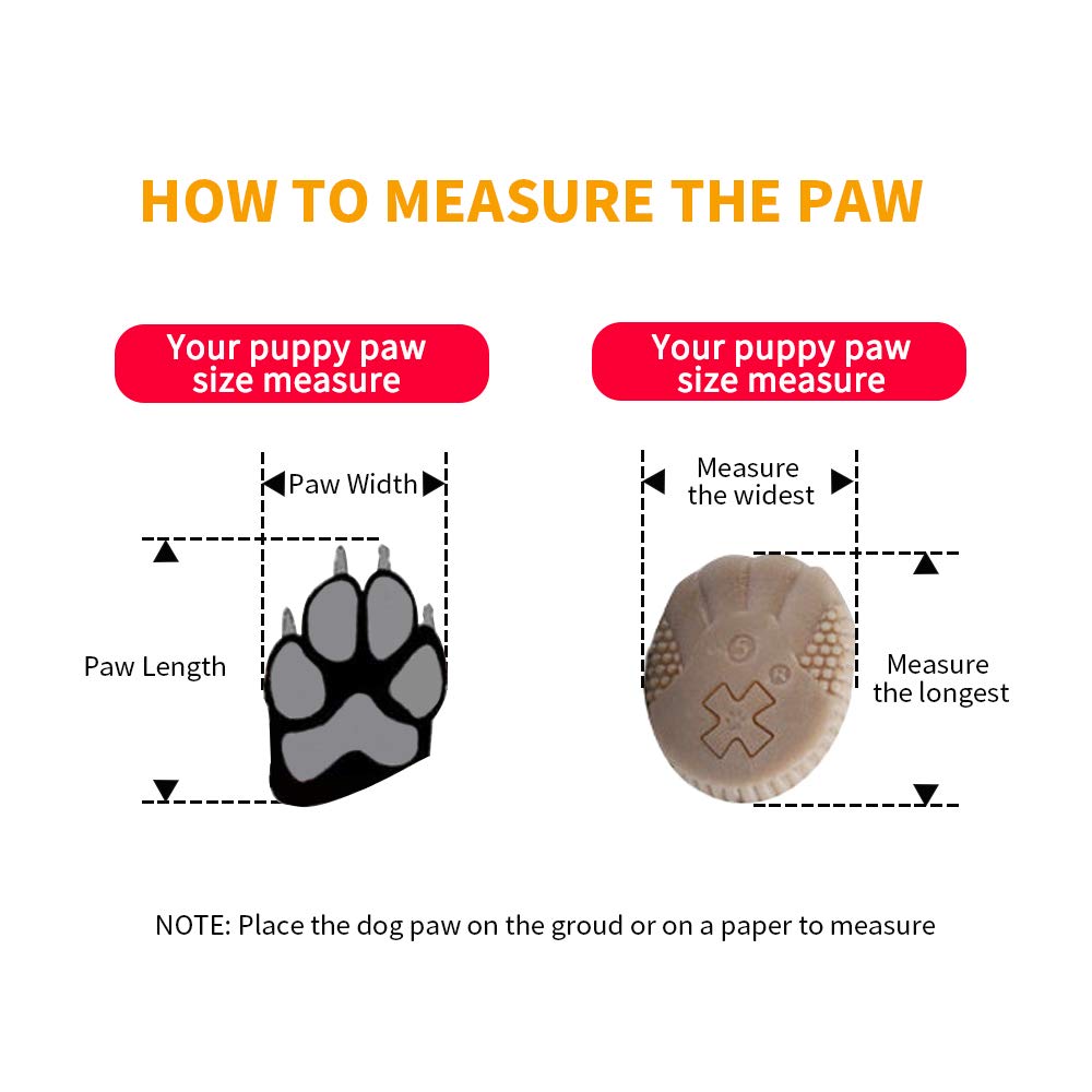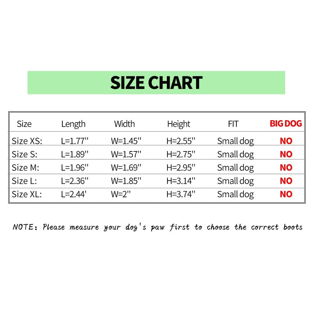 ?CHECK THE MEASUREMENT & HELP NOTE?NOTE: THIS IS ONLY FIT SMALL DOGS NOT LARGE DOGS. Our dog boots have 5 different sizes for your little puppy you should follow the measure steps to correct select the size.