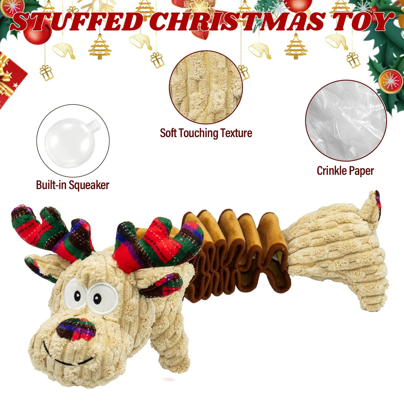 The Cneeeeeb Squeaky Dog Toys Are The Perfect Interactive And Durable Chew Toys For Dogs Of All Sizes, And Great Christmas Gift For Your Lovely Dogs, These Toys Are Designed To Provide Endless Entertainment And Satisfy Your Dog'S Natural Urge To Chew, Tug, And Play. Made From High-Quality Pp Cotton Material, These Toys Are Soft, And Safe For Your Furry Friend To Play With. The Deer Shape Design Adds Extra Durability, Making Them Perfect For Even The Most Enthusiastic Chewers. The Main Material Used In These Toys Is Corduroy And Cotton Rope, Which Not Only Ensures Their Durability But Also Makes Them Comfortable To Hold And Play With. The Main Material Is Soft And Gentle On Dogs' Teeth And Gums, Ensuring A Safe Chewing Experience. Each Toy Is Filled With Safe Pp Cotton, Providing Additional Comfort And Support During Playtime. The Plush Filling Also Enhances The Toy'S Squeaking Sound, Adding An Interactive Element That Will Keep Your Dog Entertained For Hours. One Of The Standout Features Of These Toys Is The Advanced Chinese Embroidery, Which Adds An Elegant And Stylish Touch To The Overall Design. This Attention To Detail Sets These Toys Apart From Others On The Market, Giving Them A Unique And Appealing Look. With Approximate Dimensions Of 11.8*4.53*7.87 Inches, These Toys Are Suitable For Small, Medium, And Big Dogs. Whether Your Dog Loves To Play Fetch, Engage In A Game Of Tug-Of-War, Or Simply Enjoys Chewing, These Toys Have Got You Covered. Overall, Squeaky Dog Toys Are The Perfect Combination Of Fun, Durability, And Safety. Your Furry Friend Will Love Playing With These Christmas Deer Shape Chew Toys, And You Can Rest Assured That They'Re Made Of High-Quality Materials, But Not For The Harshest Chewers. The Squeaky Sound Bag Placed Inside Can Attract The Dog'S Attention And Make The Dog Love To Play With The Toy,Crinkle Paper Stuffed Plush Dog Toy