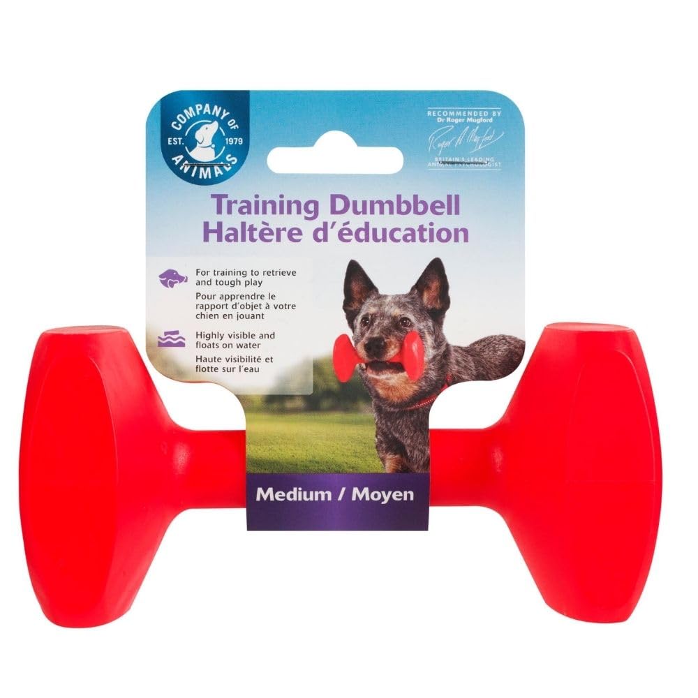 Q: What is the size of the Company of Animals Training Dumbbell?A: The Company of Animals Training Dumbbell is available in a medium size, measuring 14 cm in length, making it suitable for various dog breeds.