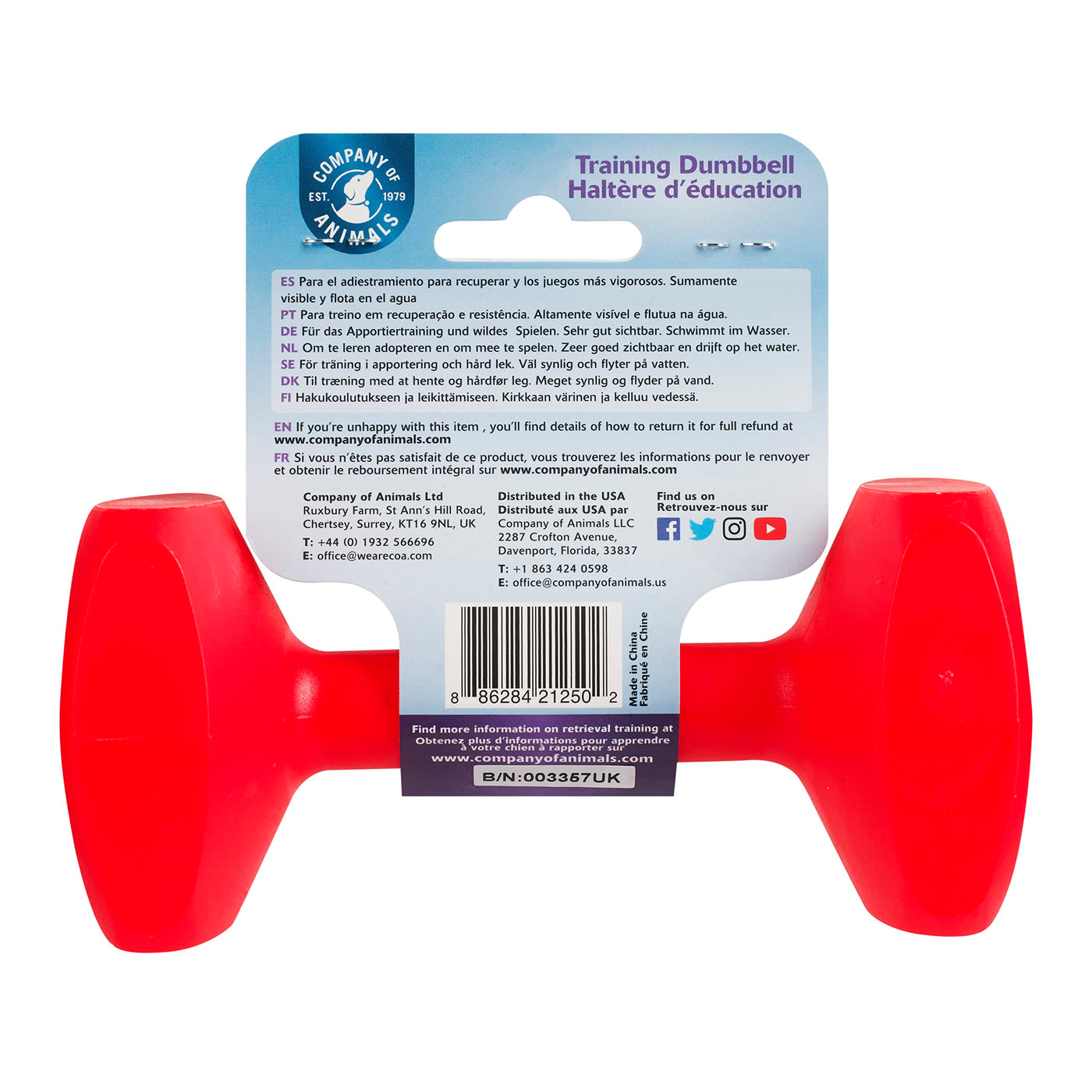 Q: What materials are used to make the Training Dumbbell?A: The Training Dumbbell is made from highly durable molded plastic, ensuring it withstands vigorous play and is tough enough for everyday use.