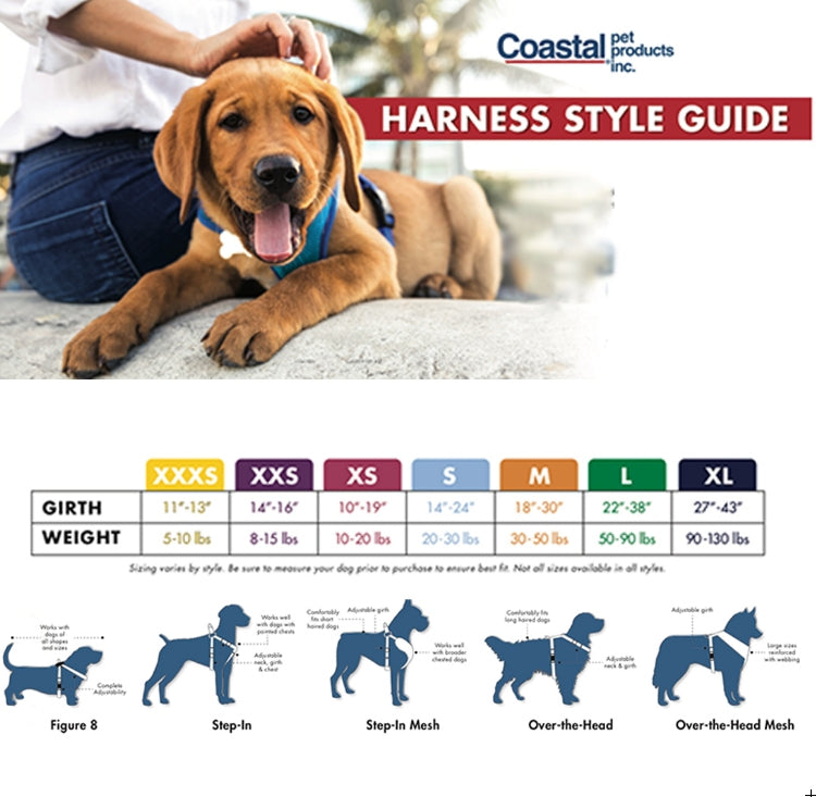 Q: What sizes does the Coastal Microfiber Dog Harness come in?A: The Coastal Microfiber Dog Harness is available in an extra-small size that fits dogs with a girth measurement between 14 to 16 inches.
