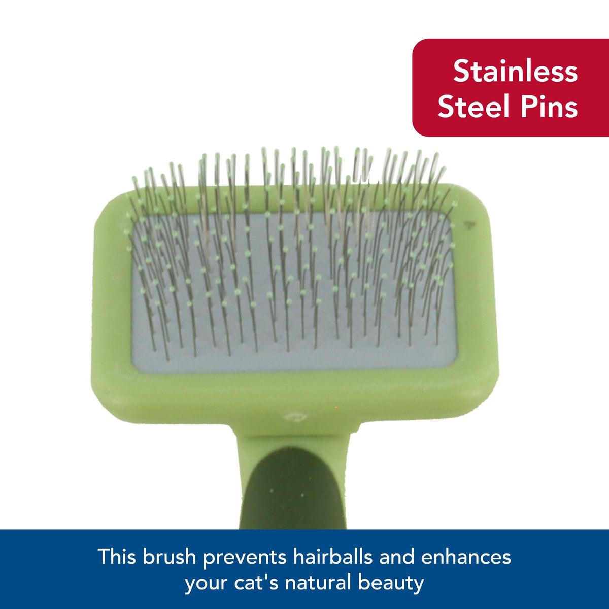 Q: How does the Coastal Pet Safari Cat Soft Slicker Brush help reduce shedding?A: The Coastal Pet Safari Cat Soft Slicker Brush features stainless steel pins that effectively remove loose hair and mats from your cat's coat, significantly reducing shedding and preventing hairballs.