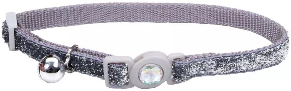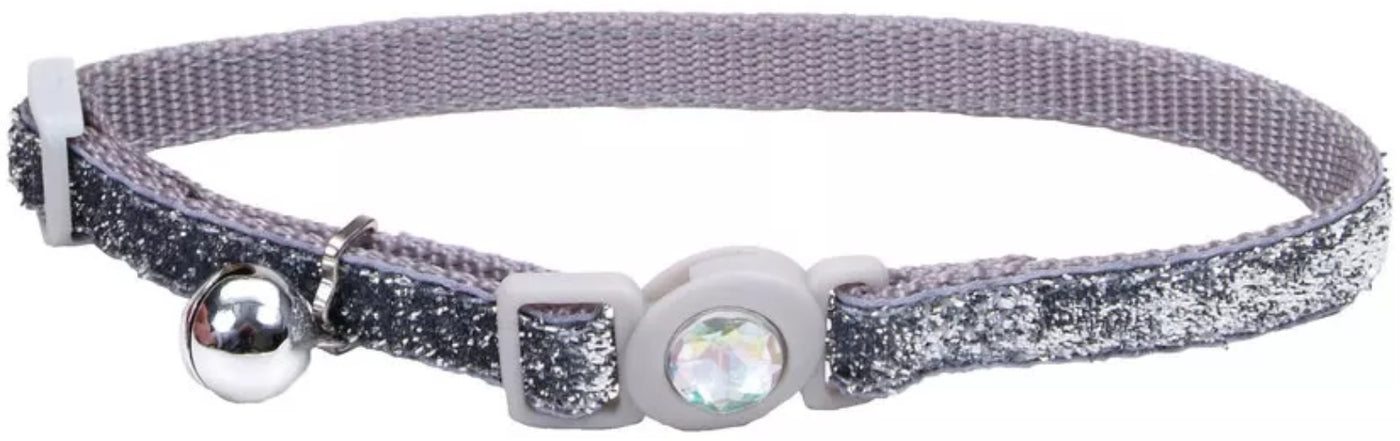 Q: What sizes does the silver glitter breakaway cat collar fit?A: The 6723 12 Slv 3/8 Cat Safety Collar is designed to fit neck sizes ranging from 8 to 12 inches, making it suitable for most cats.