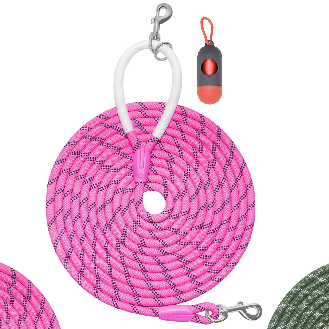 SPECIFICATION Size: 2/5 (1.0cm) diameter rope. 12ft, 20ft, 30ft, 50ft four length Color: Purple Material: Climbing Nylon Rope, Heavy Duty Hook, Silicone Connect Application: Hiking, camping, training, hunting, backyard, beach, recall training, outdoor play ABOUT THE LONG ROPE DOG LEASH Double end with 2 heavy duty hook. 360 degree swivels to resist twisting. It works great as a dog leash to tie out to a tree or railing; used as a clothesline; it also works as a bundling rope, luggage strap, etc A check cord is a great tool for exercising and training dogs. Lightweight and easy to coil and carry,this rope lead has four length for different training purpose,feel soft on your hands,12FT 20FT 30FT 50FT, it has enough length to allow them wandering and ensure your command to be obeyed, great for teach your dog recalls and other obedience, skills, use it as a Our long dog leash is great for medium and large dogs. You'll love using it as a backyard dog leash, for off leash dog training, and more. training leash provide extra strength for controlling large dogs. This extra long training lead is designed for distance training. PACKAGE: 1 x Long rope dog leash 1 x poop bag dispenser with 15 bags Warm Note: Before use please check the leash if it was bitten. Please hung on the dog harness, do not put it around the dog's neck.