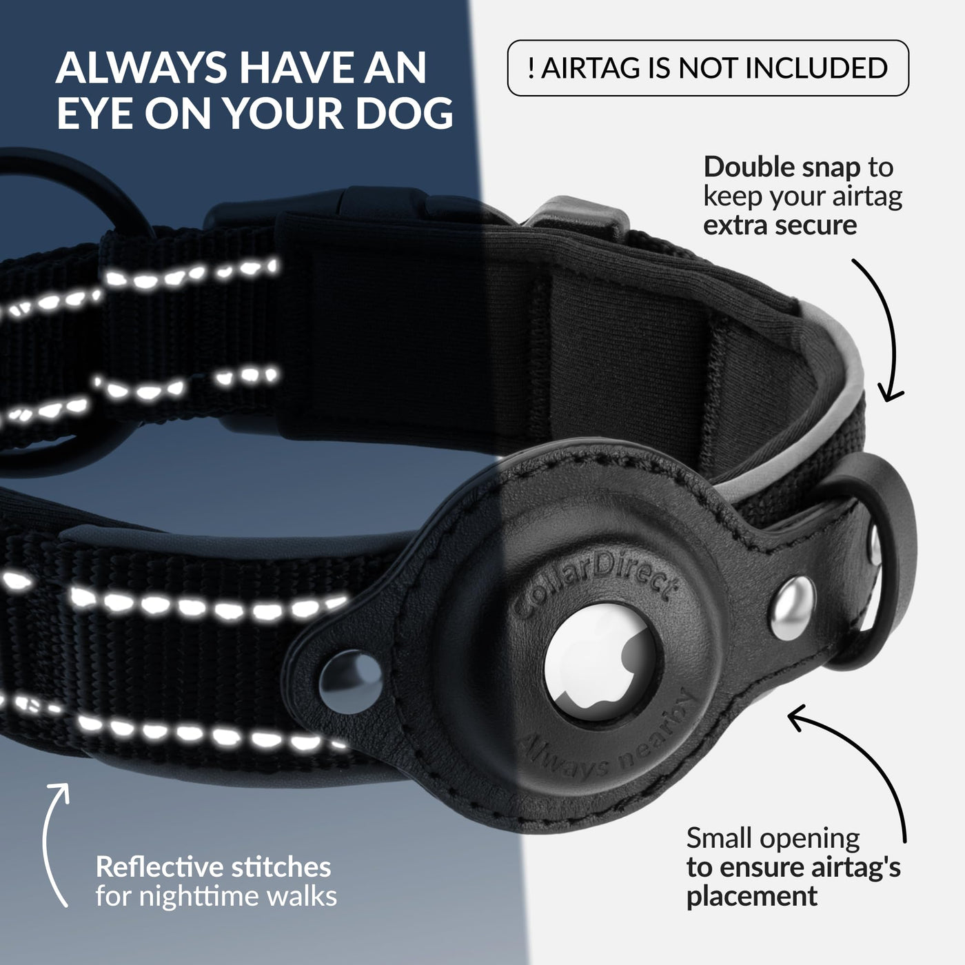 Collardirect Airtag Dog Collar Reflective Nylon Neoprene Leather Holder For Apple Air Tag For Large, Medium, And Small Dogs (Bla