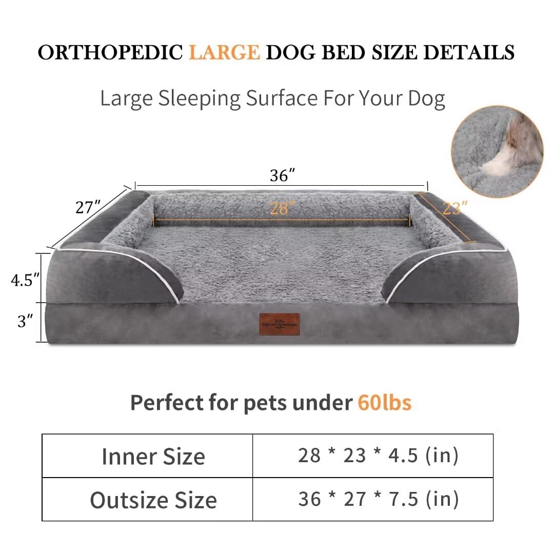 Comfort Expression Cooling Dog Bed for Large Dogs Orthopedic Memory Foam Dog Bed Waterproof Dog Beds Washable Dog Bed with Removable Cover Pet Bed Dog Sofa with Bolster(Large Grey)