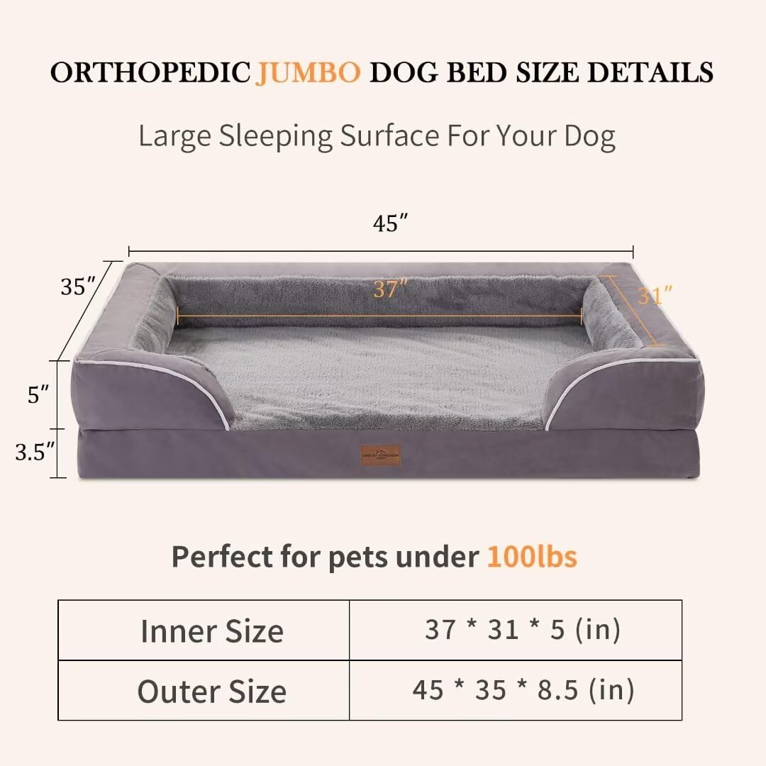 Q: What size dogs is the Comfort Expression Jumbo Dog Bed suitable for?A: The Comfort Expression Jumbo Dog Bed is designed for extra large dogs, making it suitable for breeds weighing under 100 lbs. Its spacious sleeping area of 37 x 31 inches provides ample room for your pet to rest and play.