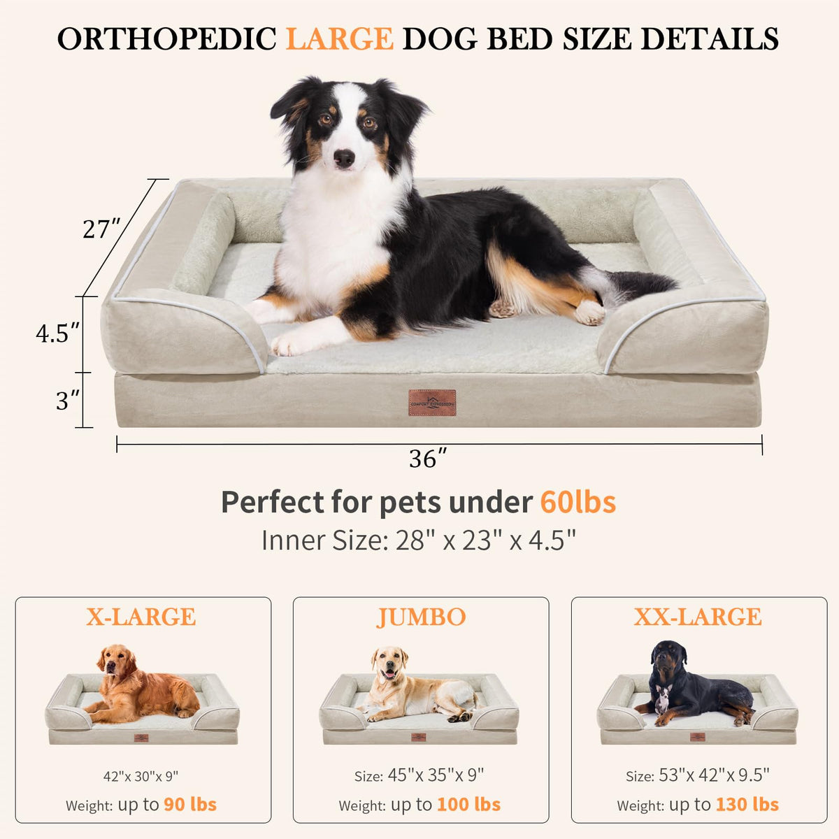 Comfort Expression Waterproof Dog Beds for Large Breed Dogs Large Dog Beds Orthopedic Foam Comfy Pet Bed Sofa with Washable Removable Cover & Non-Slip Bottom(Large Beige)