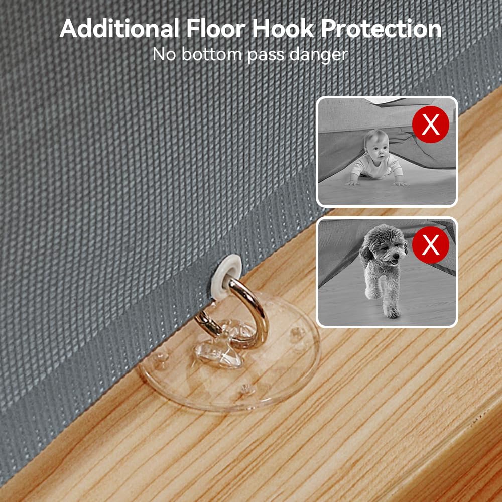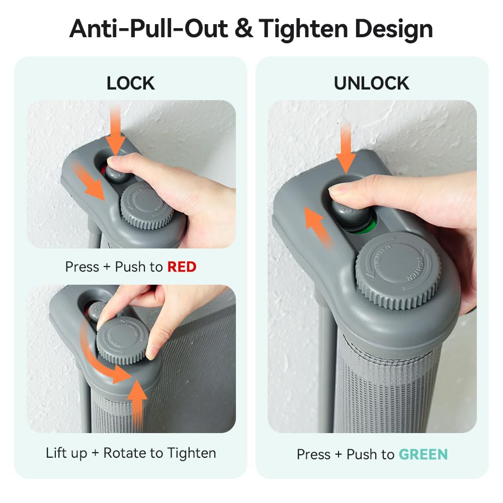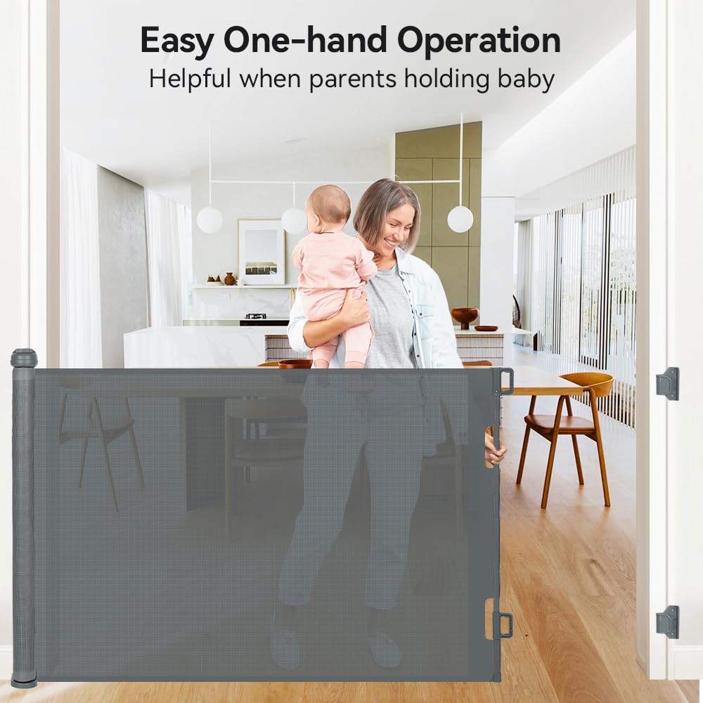 118 W x 34 H: The retractable baby gates is ideal to various indoor and outdoor spaces. Ideal as a baby or pet gate, the retractable dog gate easily retracts for space-saving convenience while maintaining a homes aesthetic | Secure&Sturdy Baby Gate: No need to worry about sneaky escapes with this safety gate! Its improved design includes 3 floor hooks for solid anchoring. Plus, a rotating knob tightens the mesh door net, preventing sagging and effectively confining young children or pets. Made from high-quality, sturdy mesh, the baby gates extra wide resists warping and wrinkling | Lockable Safety Design: The retractable pet gate features a lockable design at the top for added security. A press and slide switch locks or unlocks the extra long pet gates, with red and green indicators for clear understanding. The hidden lock keeps the child gate secure from inquisitive hands. NOTICE: When the indicators shows red, it can only be locked and not stretched outward | One-Hand Control: With one-hand control, you can lock or unlock the extra long dog gate even while carrying your child. There is no bottom railing, eliminating tripping hazards when passing through | Easy to Install and Use: Installation is easy with accompanying accessories suitable for various wall types. The retractable gates for dogs includes sliding adjustments on its side for installation near skirting lines or on gypsum walls, preventing wall cracking. However, please note that installation of this extra wide mesh dog gates for the house requires drilling
