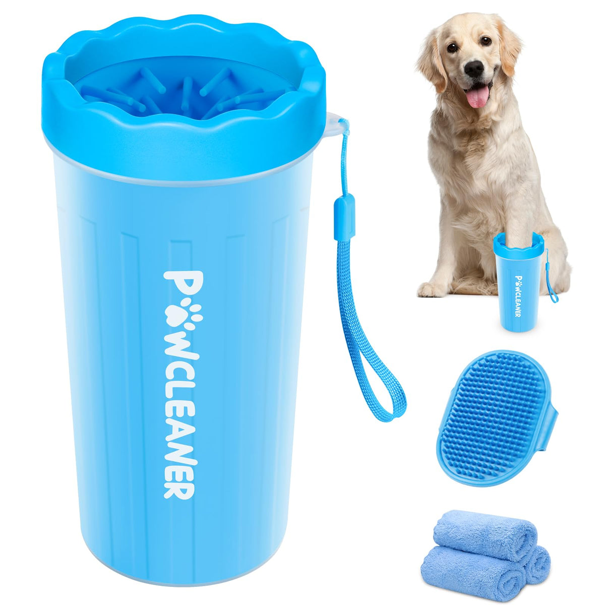 Comotech Dog Paw Cleaner With Bath Brush & Absorbent Towels - Adjustable Ring Handle For Long And Short-Haired Dogs (Large, Blue)