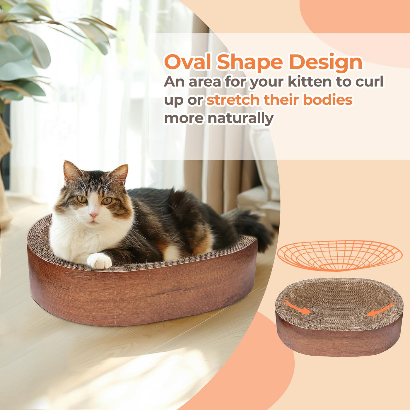 Enhance Your Cat'S Scratching Experience With Comsaf Premium Cat Scratchers. The Oval-Shaped Scratcher Is A Unique Design That Combines A Lounge And A Scratcher Into One, Making It A Wonderful Spot For Your Cats To Rest And Scratch For Hours. It'S A Versatile Solution That Ensures Your Cats Stay Comfortable And Entertained. Additionally, It Acts As A Furniture Protector, Safeguarding Your Sofas, Carpets, Curtains, Mattresses, And Floors From Potential Damage By Attracting Your Cat'S Natural Scratching Instincts Towards The Scratcher. The Wood Grain Pattern In 17L X 12.5W X 4H Inches Offers A Modern And Stylish Addition To Your Home Decor. Made From Recycled Corrugated Cardboard, It'S Not Only Eco-Friendly But Also Recyclable. Immerse Your Cats In Comfort And Fun While Keeping Your Home Clean And Stylish.