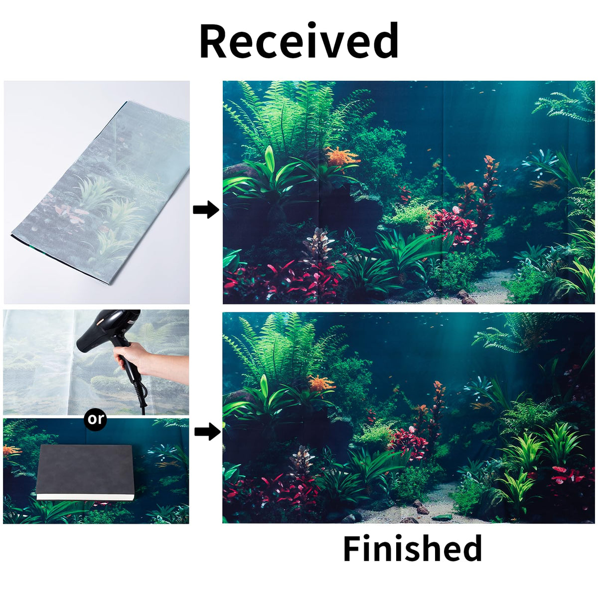 Is an aquarium background just a decoration for fish or pet reptile keepers? Of course not. Due to some aquariums being reflective, some pet friends can easily be scared of their reflection and shadows. Adding an aquarium background can limit the reflections and shadows, making your fish or pet reptile feel more comfortable and relaxed. Our aquarium backgrounds come in multiple options, allowing you to find the good image that fits your aesthetic to increase the visual appeal of your aquarium. Aquarium backgrounds with vibrant colors and images can make your pet friends comfortable and block some messy items behind the aquarium, making the overall appearance of your aquarium more tidy and beautiful. Which color background is fit for fish or pet reptiles, light or dark? There is no correct or wrong answer. Different fish and pet reptiles have different needs in an aquarium background. Except for the aquariums lighting that affects the aquariums beauty and your pets comfort, the colors of your aquarium background should match the colors of your fish, decoration, and lighting equipment. Our aquarium background with clear images and bright colors can make pet fish or pet reptiles active and create an appealing and immersive experience for you and your pet friends. Easy to install: 1. Use a soft damp cloth and mild soap or aquarium-safe cleaner to remove any dirt, or stains on the back of your aquarium. 2. Use sharp scissors to trim off any excess white edges of the background. 3. Attach double-sided tape to four corners of your background. 4. Apply the background to the back of your aquarium. No Bubbles No removing all things from your aquarium Due to printing, the color of each batch product may be slightly different from that shown in the picture. There are manual measurement differences and the sizes of the product may be 0.5-1 inches of error. Removing Wrinkles: Our cloth aquarium background might arrive with slight wrinkles due to packaging folds and shipping. To remove wrinkles, 1. Lay your background flat on your table and place it under heavy things like books for 1-2 days to reduce wrinkles. 2. Gently use a hairdryer on a low heat setting and keep the hairdryer moving to prevent melting. The heat will help the terrarium background regain its smoothness. Our aquarium backgrounds are external. They dont take up any space in your aquarium. You dont need to spend time relocating all things from your aquarium when washing the background or aquarium. You need to take down the background and clean the affected area. Finally, reapply it with double tape on the back of the aquarium.