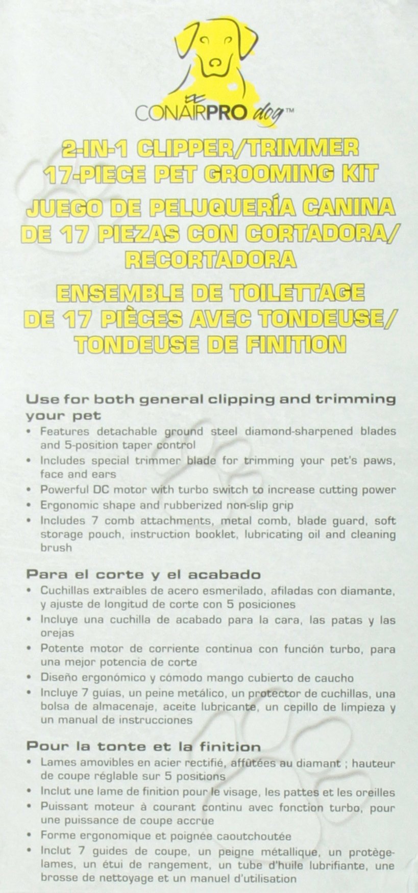 Conair dog 2-in-1 clipper/trimmer kit is designed for both general clipping and trimming of your pet. It features a 5-position, adjustable, detachable, ground steel diamond-sharpened blade and an ergonomic shape. Includes a special trimmer blade for trimming your pet's paws, face and ears. This 16-piece pet grooming kit includes 7 comb attachments, metal comb, blade guard, Soft storage pouch, INSTRUCTION booklet, lubricating oil and cleaning brush. Conair dog offers pet owners a complete line of home grooming kits, trimmers, pet dryers, grooming tools and pet accessories.