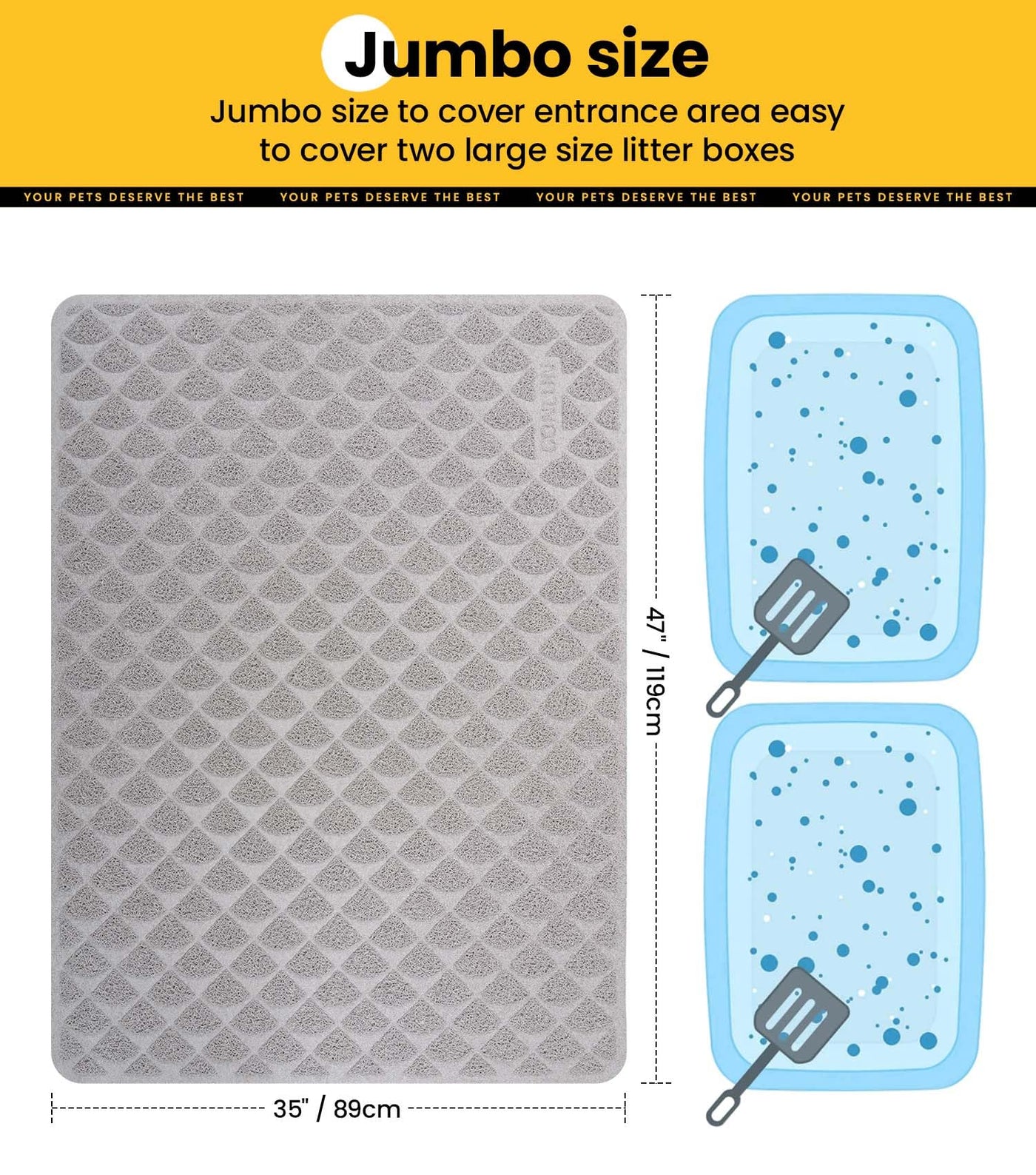 Tired Of Constantly Finding Cat Litter Scattered Around Your Home? Put An End To The Mess With The Conlun Cat Litter Mat! Our Unique Design Traps Litter As Your Cat Exits The Litter Box, Keeping Your Floors Spotless. Crafted With Your Cat'S Comfort In Mind, Our Mat Is Made From Soft Pvc Material, Providing A Gentle And Cushioned Surface For Your Kitty To Walk On. Plus, Its Durable Rubber Backing Ensures The Mat Stays In Place, No Matter How Much Your Cat Moves Around. Our Litter Mat Is Not Only Long-Lasting And Scratch-Resistant But Also Waterproof And Urine-Proof, Making Cleaning A Breeze. Lab-Tested And Certified To Be Phthalate And Bpa-Free, It'S Safe For Your Pet And The Environment. Cleaning Up Is Simple - Just Shake, Vacuum, Or Rinse With Soapy Water. For Optimal Performance, Air Dry The Mat Fully Before The Next Use (Avoiding Direct Sunlight). Available In Two Sizes And Two Stylish Colors, Our Cat Litter Mat Complements Any Home Decor. Make Your Life Easier And Keep Your Floors Clean - Order Your Conlun Cat Litter Mat Today!