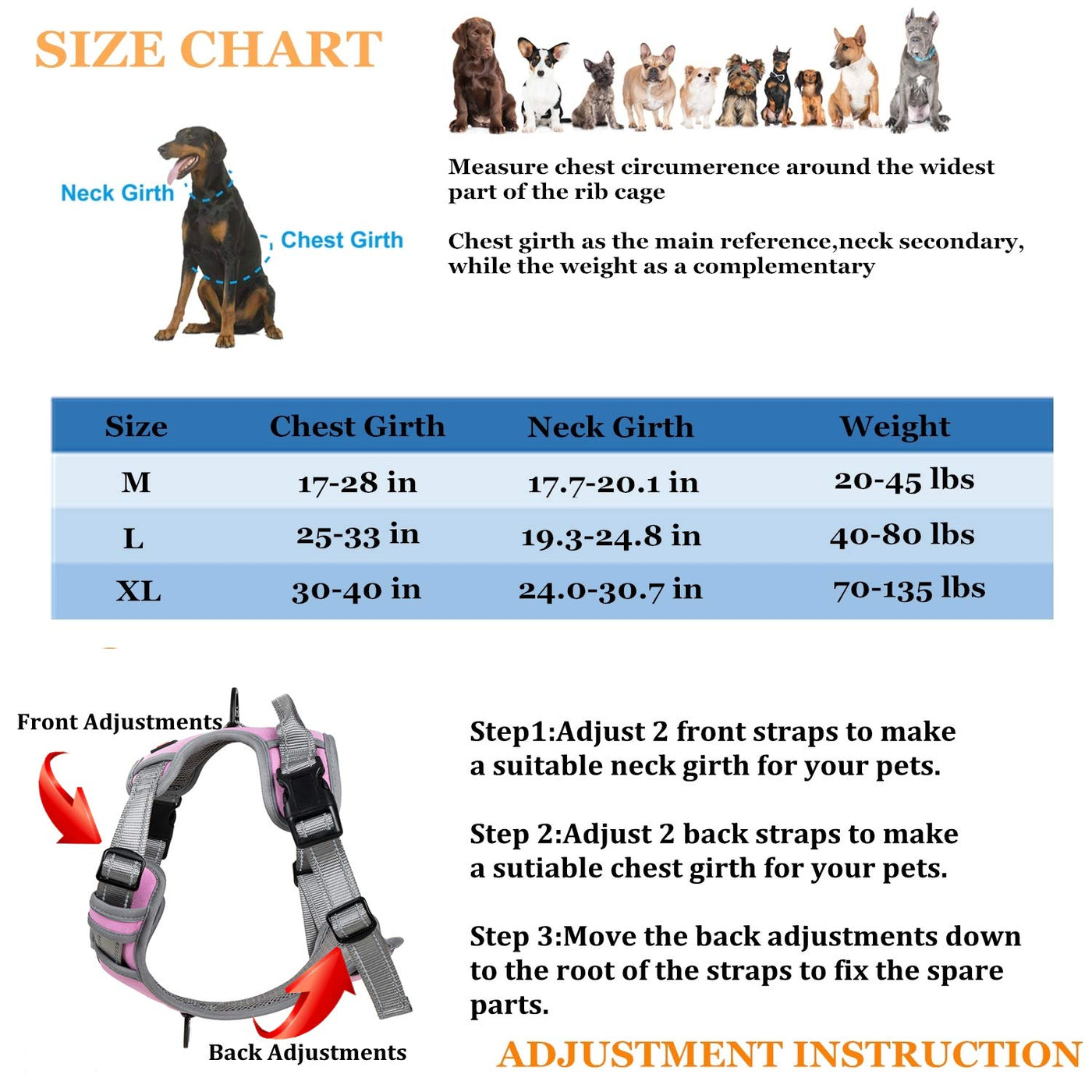 SIZE Medium Size: chest girth 17-28 inches Neck girth 177-201 inches for dogs of 20-45lbsAdjusting 2 front buckles to make a suitable neck girth for pets Adjusting 2 back buckles to make a suitable chest girth for pets with 2 fingers space under the strapsMoving the 2 back adjustments down to the root of the straps to fix the spare parts EASY This no pull dog harness has 2 easy buckles on belly straps and 1 more lockable Quick-snap buckle on neckline for easy on and off NO NEED to slip over dogAs head and adjust the straps every timeAnd also has fully adjustable straps at the chest and neck which allow a custom fit for your pet SAFE Pulling pressure is evenly distributed to the body to prevent Pulling and choking Large area reflective stitching for night use providing added visibility during late-evening or early morning walks for your and your dogA safety comfortable Breathable mesh lining with soft sponge padding plate of our dog harness prevents dog injuries giving extra comfort and protectionOur front lead dog harness has two sturdy metal leash attachment points front clip for discouraging pulling and back for relaxed walks SERVIcE Your satisfaction is our first priority we take care of all quality-related issues with a REPLAcEMENT OR RETURN If you encounter any problem while using please never hesitate to send email to us and we will make it all right for you