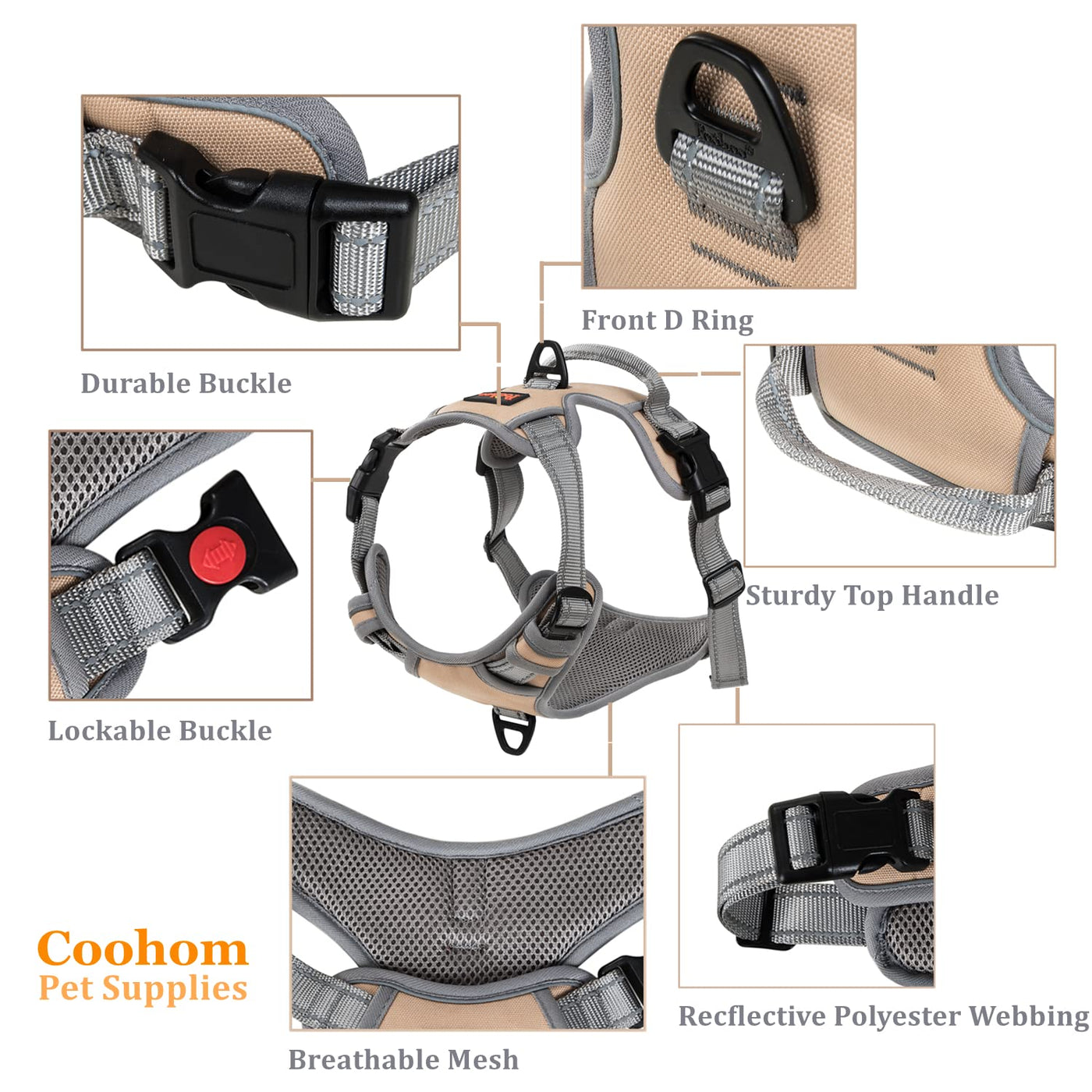 Coohom No Pull Dog Harness With Handle And Two Leash Attachments,Adjustable Outdoor Pet Harness With Reflective Oxford Material For Small Medium Large Dogs (M, Khaki 2022)