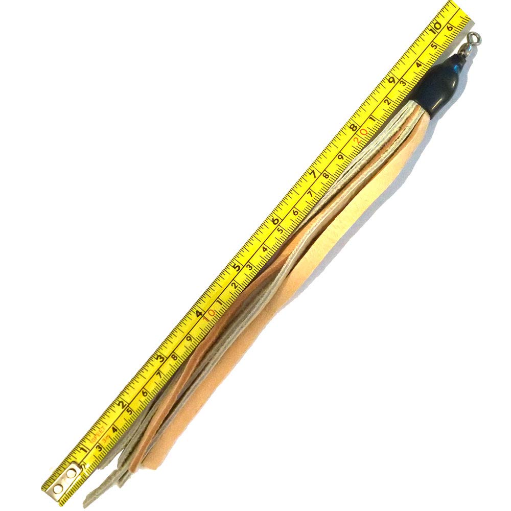 The Buffalo/Deer Leather Tasse attachment features 6 Buffalo and Deer leather tassels, each about 1/4' wide and average 8 inches long (out of the cap). The attachments are made with 3 total leather strips that are doubled over (each averages 17' long and once doubled over gives the 6 tassels). 2 types of leather are used to create a unique feel for your cat. 2 will be Buffalo (4 tassels) and 1 Deer (2 tassels) or visa-versa, making the attachment have 4 tassels of one leather type and 2 of the other. The leather tassels are connected in the cap and have a barrel swivel at the top where you connect the attachment to your wand/pole toy.