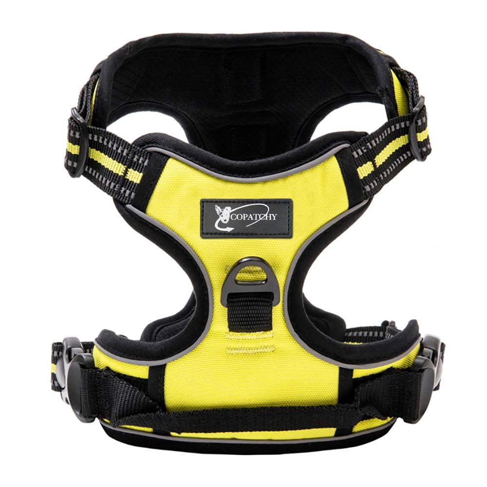 Q: Is this harness easy to put on and adjust?A: Yes, the Copatchy Dog Harness is designed for easy use. It features fast-release buckles for hassle-free overhead wearing. Simply slide it over your dog's head, buckle it up, and adjust the straps to ensure a perfect fit.