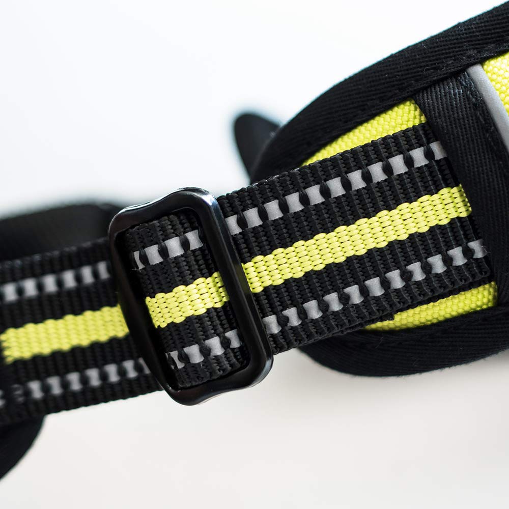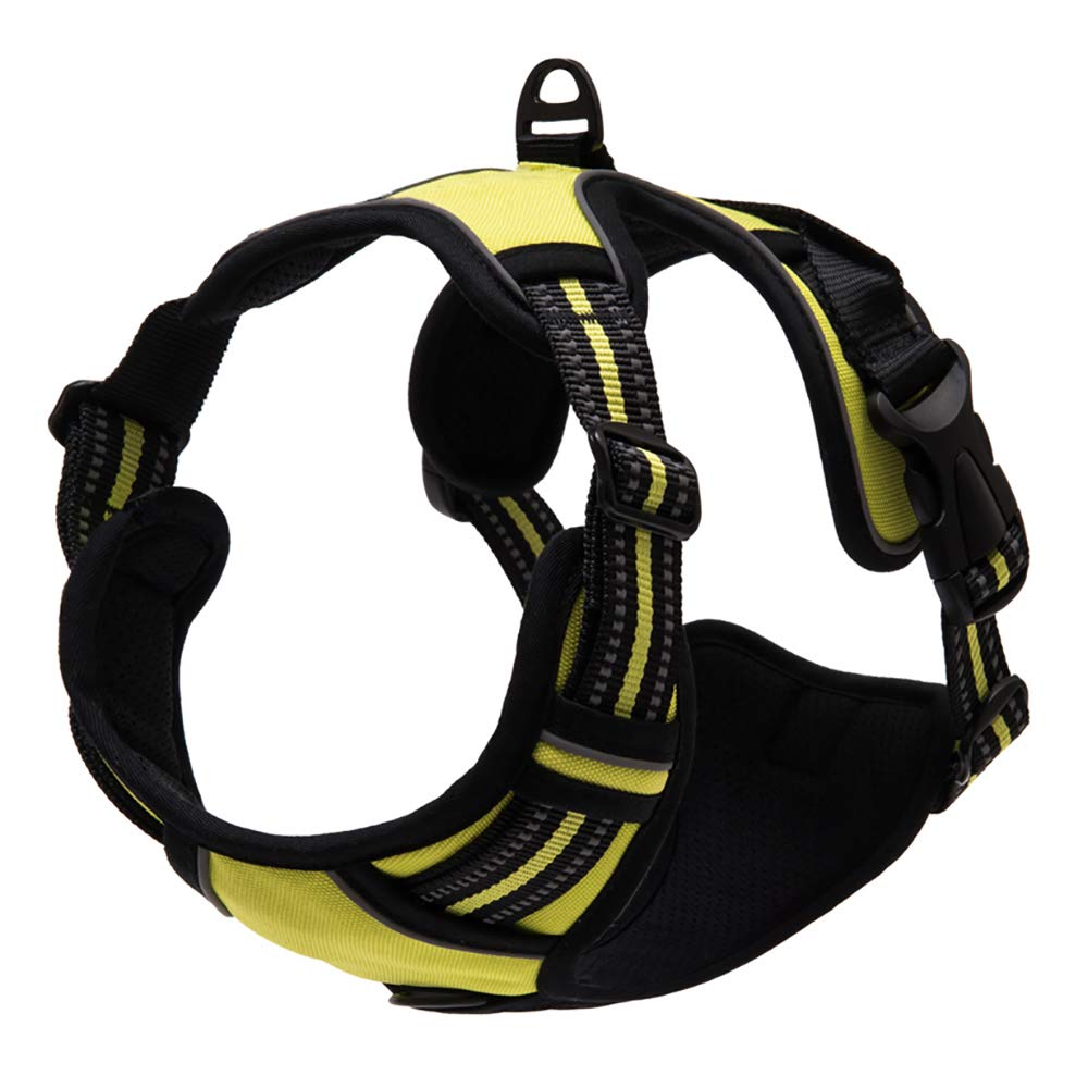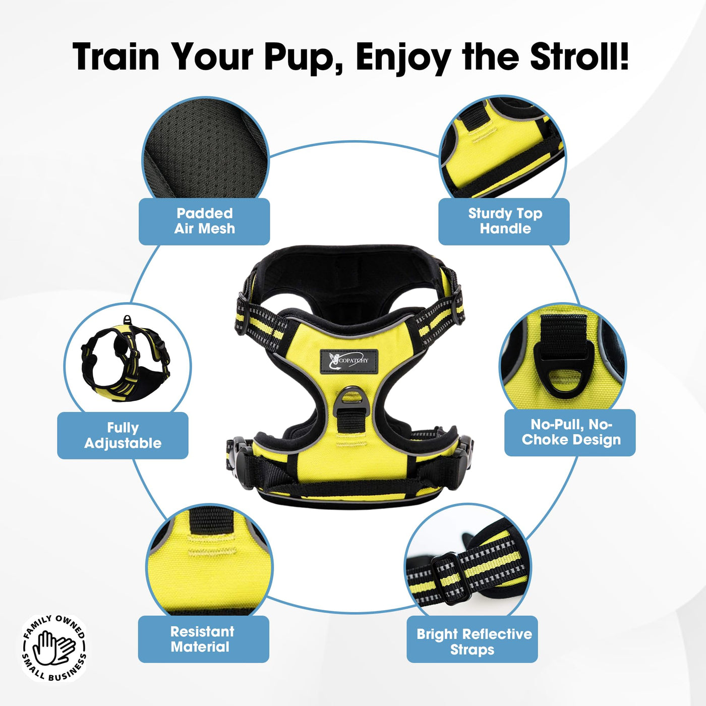 NO PULL, NO CHOKE - Specially designed with 2 Metal Leash Rings for safer dog walks. Use the CHEST attachment clip to stop your dog from pulling on walks, perfect for dog training, dog behavioral control, or strong pulling dogs. The BACK one is great for casual walks, jogging, hiking, etc EASY TO USE - Hassle Free Overhead Harness is easy to put on and off with its fast-release buckles. SLIDE the harness over your dog's head, BUCKLE it up, ADJUST the straps, and here you go! Grab the top handle for additional control. Lightweight and easy to clean FULL ADJUSTMENT - This Adjustable 'Y' harness features 4 easy adjusting straps around the body. 2 Neck straps and 2 Chest straps allow a Perfect Fit for your dog with some room of growth. No worries about slipping out or choking SAFE AND GENTLE: Comfort dog harness made of durable Nylon Oxford and padded with Soft Cushion for an enjoyable dog walking experience. Breathable mesh keeps your dog cool while minimizing the chance of hurting in case of pulling. Super bright Reflective Strips ensure a SAFE walk both day and night