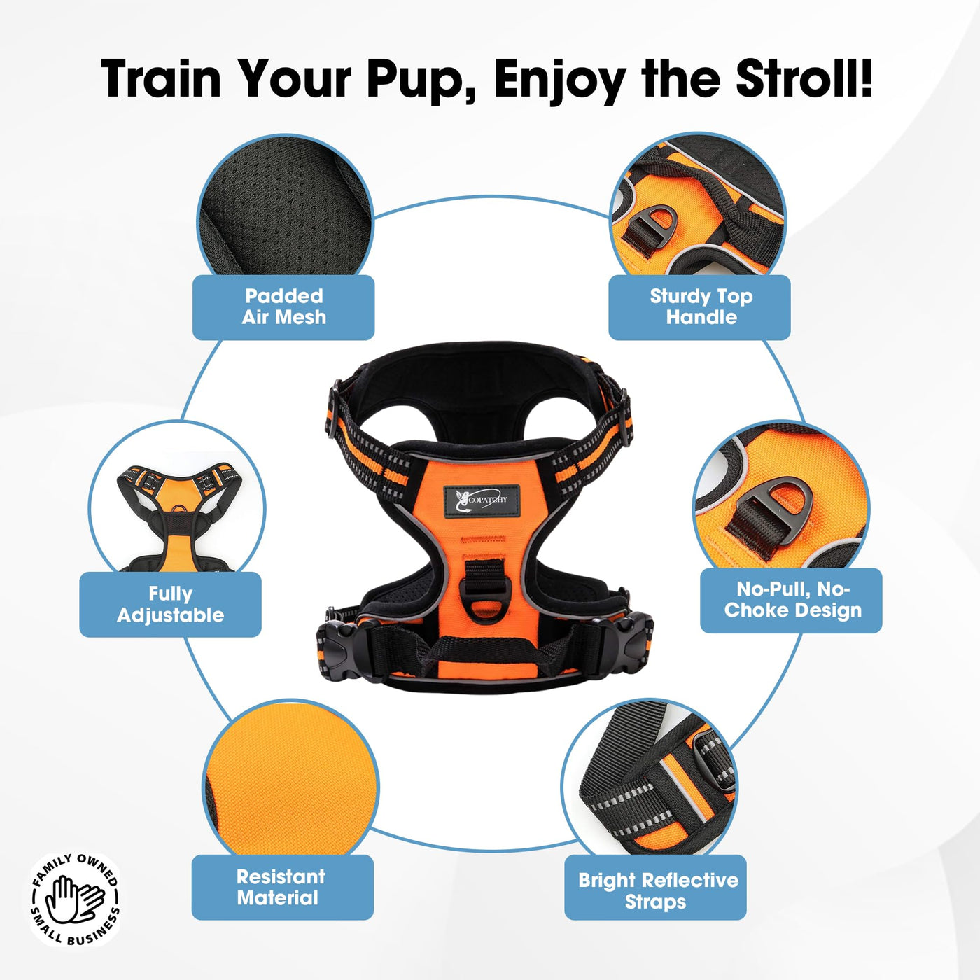 NO PULL, NO CHOKE - Specially designed with 2 Metal Leash Rings for safer dog walks. Use the CHEST attachment clip to stop your dog from pulling on walks, perfect for dog training, dog behavioral control, or strong pulling dogs. The BACK one is great for casual walks, jogging, hiking, etc EASY TO USE - Hassle Free Overhead Harness is easy to put on and off with its fast-release buckles. SLIDE the harness over your dog's head, BUCKLE it up, ADJUST the straps, and here you go! Grab the top handle for additional control. Lightweight and easy to clean FULL ADJUSTMENT - This Adjustable 'Y' harness features 4 easy adjusting straps around the body. 2 Neck straps and 2 Chest straps allow a Perfect Fit for your dog with some room of growth. No worries about slipping out or choking SAFE AND GENTLE: Comfort dog harness made of durable Nylon Oxford and padded with Soft Cushion for an enjoyable dog walking experience. Breathable mesh keeps your dog cool while minimizing the chance of hurting in case of pulling. Super bright Reflective Strips ensure a SAFE walk both day and night