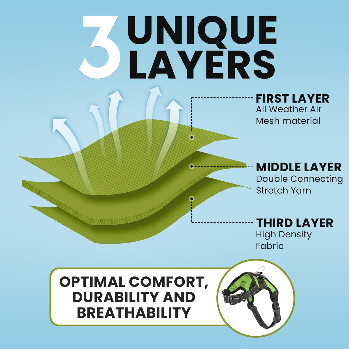 Q: How does the no-pull feature of this harness work?A: This harness features a unique anti-pull design that distributes pressure evenly across your dog's body when they pull. This helps prevent choking and reduces strain on their neck, making walks more comfortable for your dog.