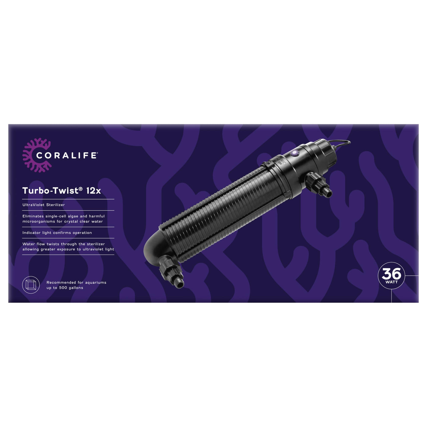 Coralife Turbo-Twist Ultraviolet Sterilizer removes free harmful micro organisms from aquarium water. This unit features a unique twist flow design that increases waters exposure to ultraviolet light improving the treatment of unwanted microorganisms. It includes mounting brackets for hang-on or in-line application for an easy setup and easy installation. Theres a indicator light to let you know when the sterilizer is operating. Uses Coralife UV Replacement Lamps. A water pump is needed and not included with the Turbo-Twist. Available in multiple sizes to accommodate a variety of aquarium sizes. Coralife is a trusted brand of marine aquarium parts and supplies. We offer aquarium lighting, filtration products, marine salt mix and more. When aquarium systems require more than just the basics - Coralife steps in. From the all-inclusive BioCube aquariums to a complete range of lighting and equipment, the Coralife brand is designed to meet the needs of the more advanced aquatic hobbyist.