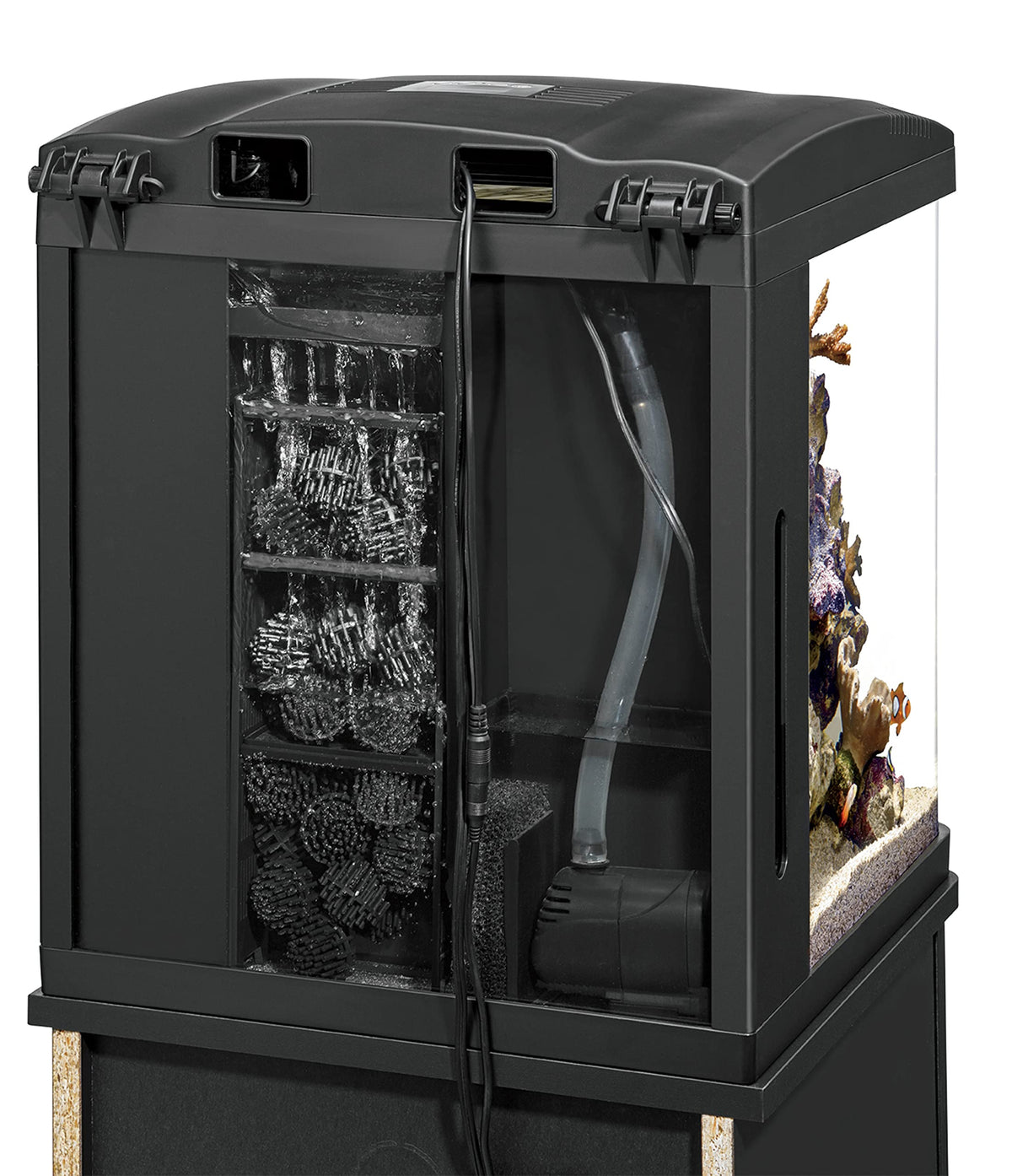 Biological filtration is accomplished by promoting the growth of beneficial nitrifying bacteria within the aquarium filter or refugium. The beneficial bacteria convert toxic ammonia and waste proteins into nitrates that are more easily removed from the aquatic ecosystem.